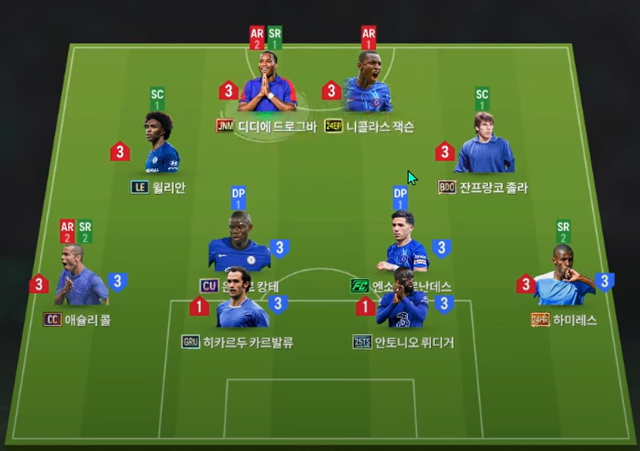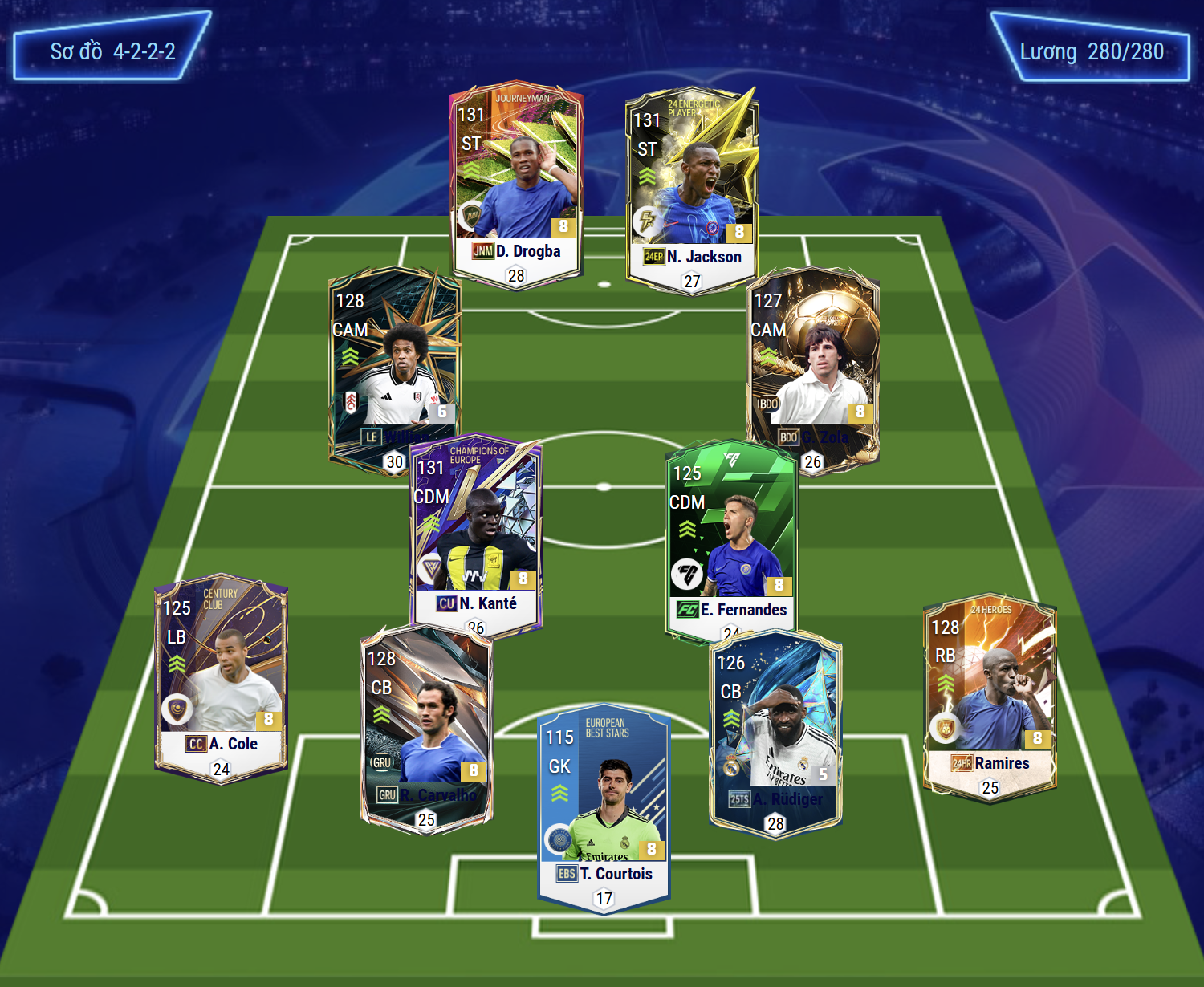 Sơ đồ được lựa chọn cho team color Chelsea là 4222 với vị trí tiền đạo cắm được tin dùng là Drogba và Jackson, cả 2 đều là những cái tên có khả năng săn bàn ấn tượng. Không chỉ có vậy, khả năng không chiến của cặp tiền đạo này cũng đem lại hiệu quả nổi bật. Tiền vệ tấn công LAM, RAM với Willian và Zola vừa sở hữu tốc độ nhanh, khả năng xâm nhập biên tốt cùng khả năng chuyền tạt cực kì ấn tượng.