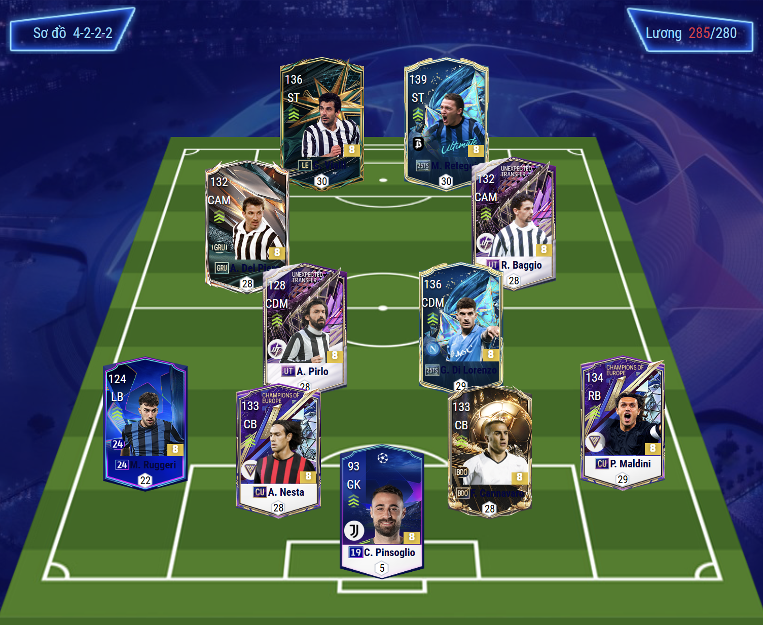 Sơ đồ 4222 được lựa chọn cho team color Italy với cặp tiền đạo được đánh giá tốt nhất hiện tại là Vialli và Retegui. Cả 2 đều là những cái tên chất lượng từ khả năng dứt điểm, không chiến cho đến AI di chuyển khá hiệu quả. Hỗ trợ phía sau là cặp tiền vệ công lệch cánh với Del Piero và Baggio vừa sở hữu tốc độ, khả năng chuyền tạt ấn tượng cùng những cú cứa lòng hiệu quả bằng cả 2 chân.