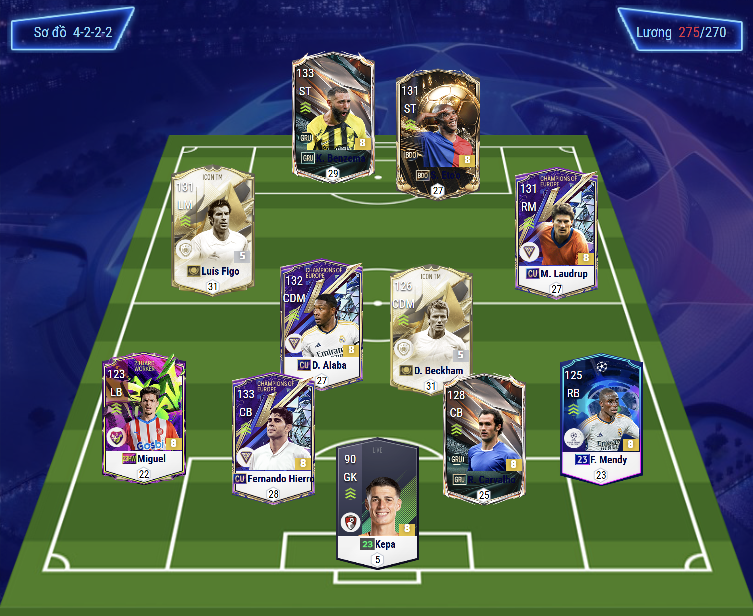 Sơ đồ 4222 với cặp tiền đạo cực kì chất lượng là Benzema và Eto'o. Đây được xem là cặp tiền đạo phối hợp khá ăn ý với Benzema chuyền rất ổn cặp với 1 Eto'o có AI chạy chỗ cực kì nhạy bén. Cặp tiền vệ cánh Figo và Laudrup đảm bảo được khả năng chuyền tạt lẫn leo biên ấn tượng.
