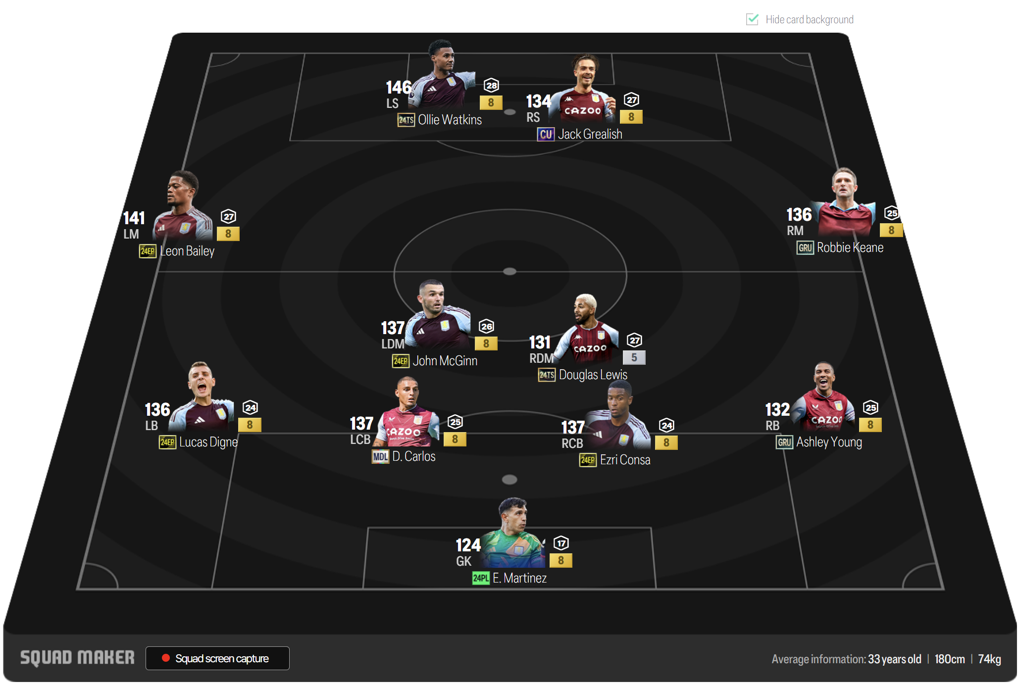 Cặp đôi tiền vệ phòng ngự với McGinn và Douglas Luiz đảm bảo chất thép cũng như khả năng chuyền bóng ở khu vực giữa sân. Trong khi đó bộ tứ vệ với Digne và Young chơi phòng ngự ở 2 bên cánh trong khi Carlos và Consa sẽ là lá chắn thép trước khung thành của E. Martinez.