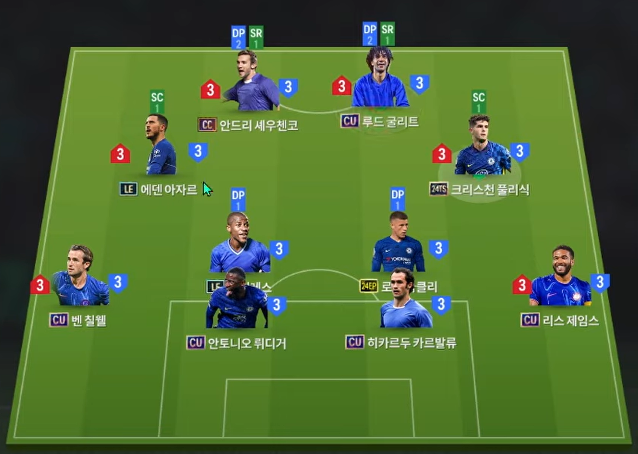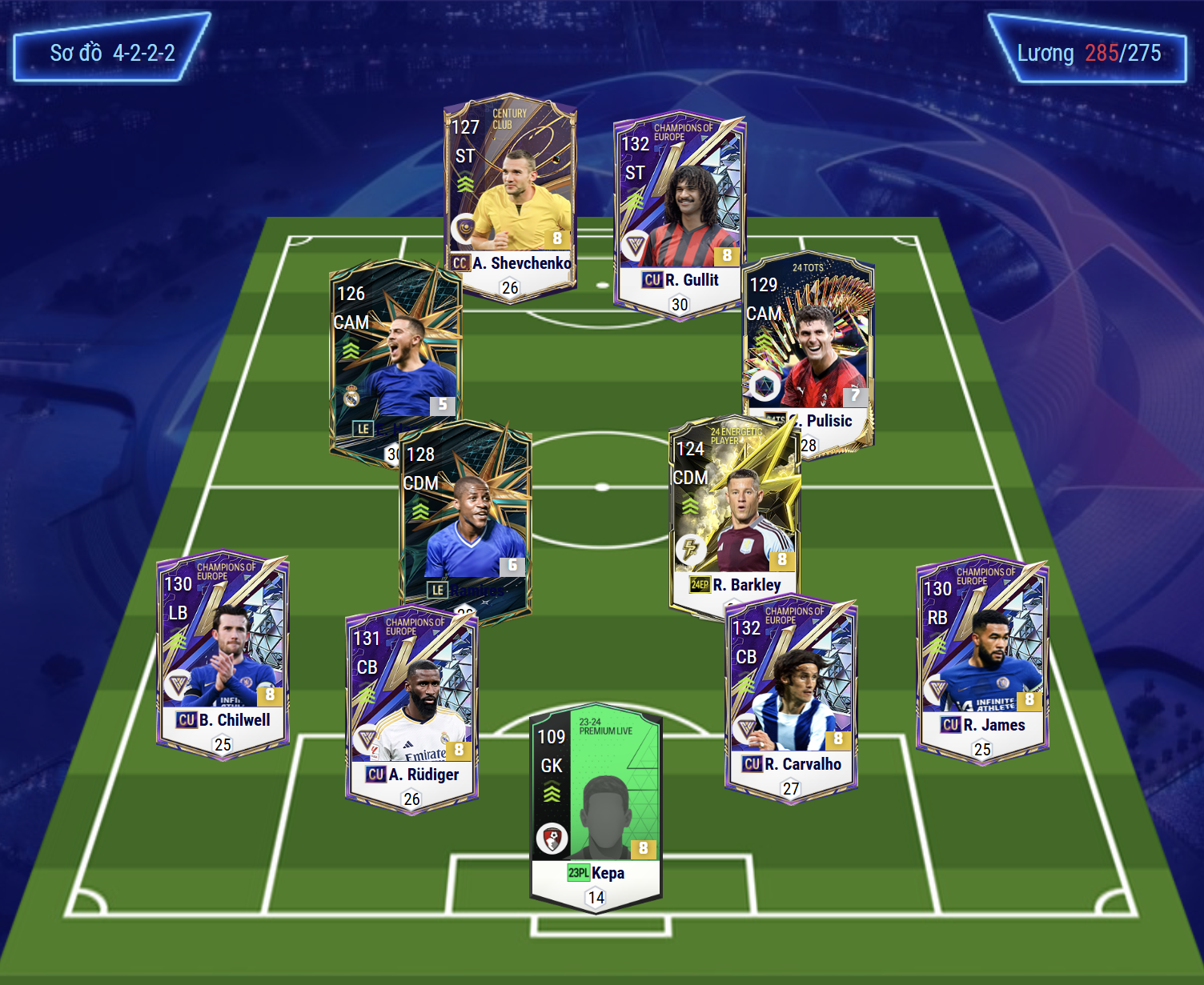 Sơ đồ 4222 được lựa chọn ở thời điểm hiện tại là dạng sơ đồ khá hiệu quả cho team color Chelsea. Cặp đôi chơi cao nhất trên hàng công là Shevchenko và Gullit, 2 cái tên quốc dân sở hữu tốc độ tốt, khả năng dứt điểm đa dạng, kỹ năng không chiến ổn và hiệu quả. Cặp tiền vệ công lệch cánh được lựa chọn là Hazard và Pulisic, 2 cầu thủ chạy cánh khá đa năng khi vừa sở hữu tốc độ tốt, khả năng xâm nhập vòng cấm thông minh, chuyền tạt hay sút đều hiệu quả.