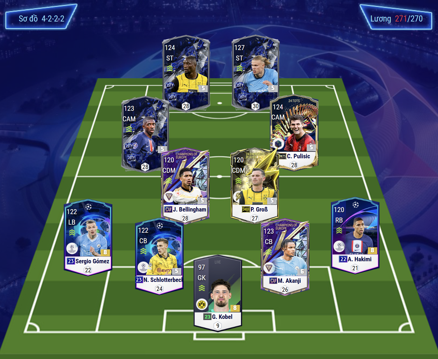 Sơ đồ 4222 với cặp tiền đạo Guirassy và Haaland, cả 2 đều cho thấy hiệu quả tấn công cực kì ấn tượng ở mùa thẻ 25TY. Bộ đôi tiền vệ tấn công Dembele và Pulisic sẽ là những cái tên đa năng từ khả năng rê bóng, chuyền bóng cho đến sút đều ấn tượng bằng cả 2 chân.