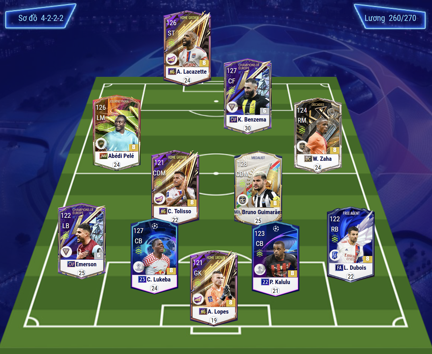 Sơ đồ 4222 được lựa chọn là dạng sơ đồ ST/CF với vị trí tiền đạo chơi cao nhất là Lacazette. Hộ công cho anh không ai khác đó chính là Benzema, một trong những cái tên quốc dân hàng đầu. Cặp đôi chạy cánh ấn tượng là Abedi Pele và Zaha.