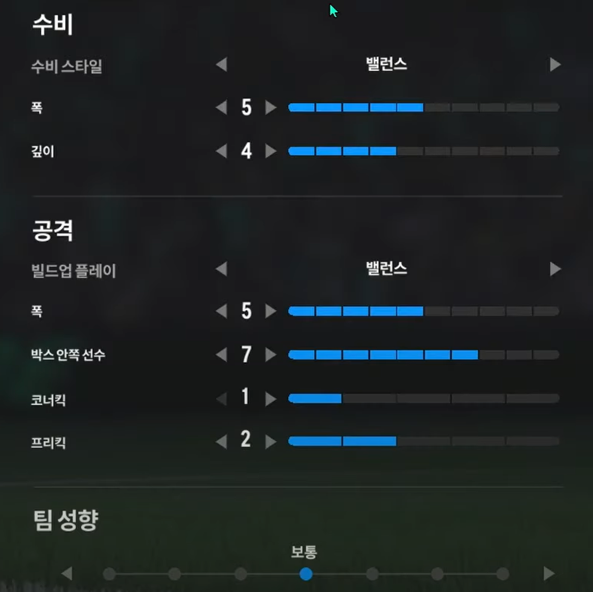 Trong khi, thiết lập tấn công "cân bằng" sẽ phù hợp cho lối chơi kiểm soát bóng, triển khai thế trận chậm, chắc ở tuyến giữa và ban bật với các vệ tinh trên hàng công để mở ra khoảng trống và ghi bàn. Ở lối chơi tấn công này, xu hướng triển khai sẽ là xu hướng chậm, chắc bóng và tìm kiếm cơ hội thay vì tấn công tổng lực và tốc độ cao.