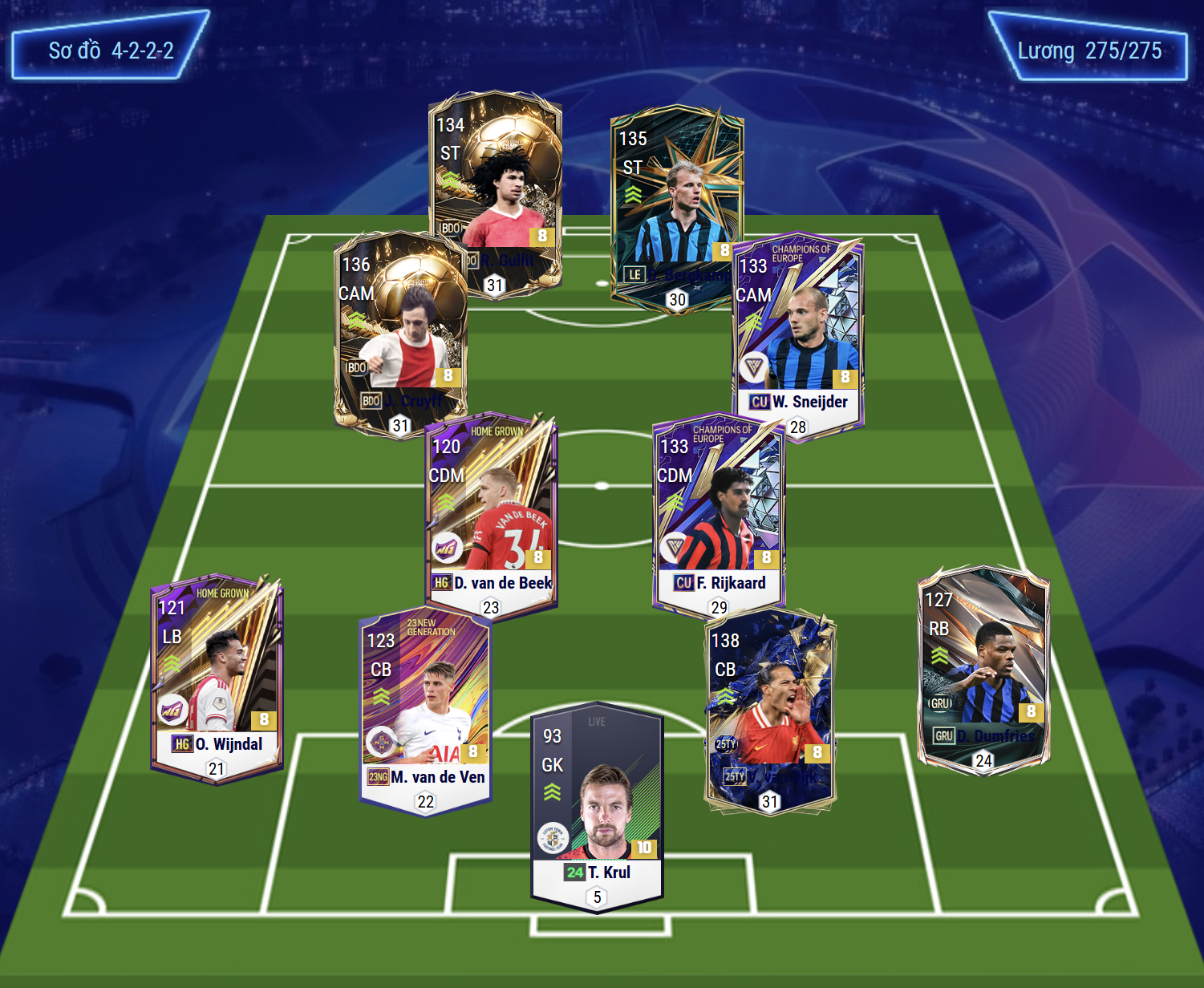 Bộ tứ vệ với Wijndal và Dumfries là 2 cái tên leo biên lẫn phòng ngự biên cực kì hiệu quả. Sở hữu tốc độ tốt, khả năng phối hợp ổn cũng như tranh chấp lì đòn sẽ là sự bổ trợ quan trong cho các tình huống leo cao hỗ trợ tấn công. Cặp trung vệ Van de Ven và Van Dijk vẫn luôn là cặp trung vệ quốc dân của FC Online bởi AI phòng ngự khôn, tốc độ nhanh và khả năng không chiến đều tốt. Krul là cái tên được tin tưởng ở trong khung gỗ hiện tại.