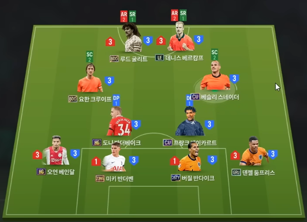 Tiền vệ tấn công với Cruyff và Sneijder cũng là những cái tên tiền vệ có tư duy chuyền bóng tốt, khả năng sáng tạo nổi bật cùng bộ kỹ năng xử lý bóng ấn tượng. Hỗ trợ phía sau là cặp đôi tiền vệ trung tâm Van de Beek và Rijkaard, cả 2 cũng là cặp đôi bổ trợ cho nhau khá hiệu quả về thể hình, kỹ năng chuyền bóng lẫn phòng ngự.