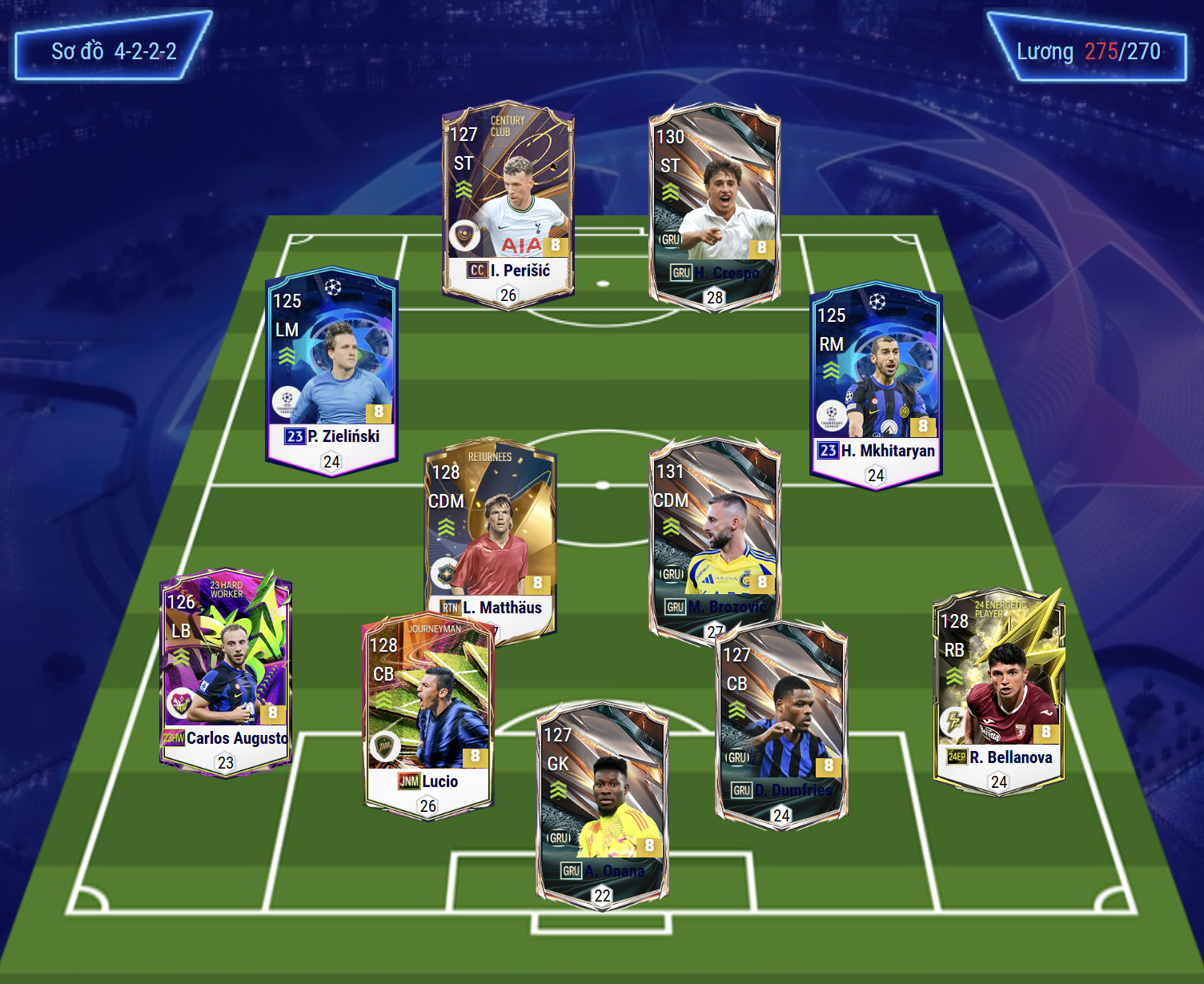 Sơ đồ 4222 với cặp đôi tiền đạo cực kì chất lượng là Perisic và Crespo. Cả 2 sở hữu kỹ năng dứt điểm đa dạng, không chiến tốt và bổ trợ cho nhau khá hay. Cặp tiền vệ cánh được tin dùng là Zielinski và Mkhitaryan, 2 tiền vệ biên sở hữu 2 chân 5-5 và khả năng chuyền tạt lẫn sút xa khá ấn tượng.