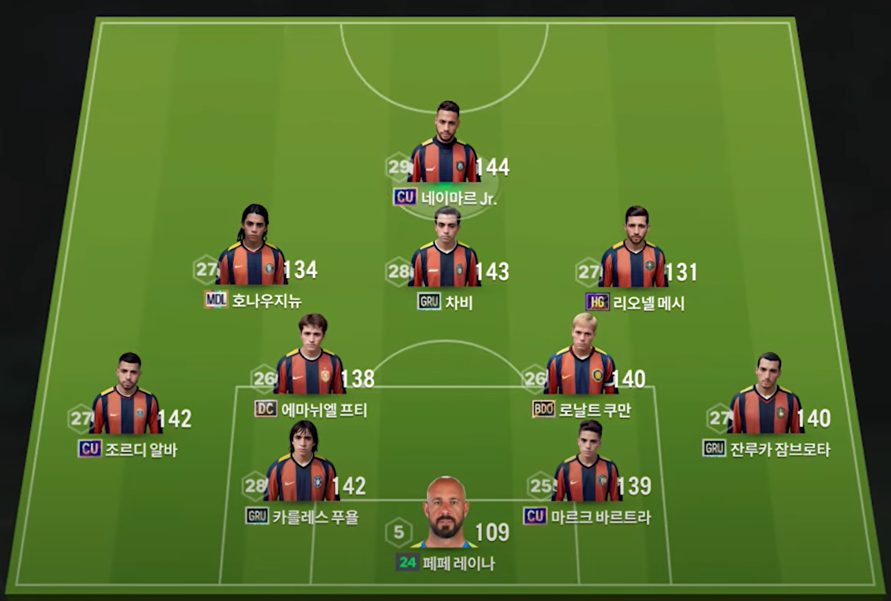 Sơ đồ 4231 không tiền đạo với vị trí cao nhất trên hàng công là CAM được lựa chọn là Neymar. Bộ 3 tiền vệ trung tâm LCM, CM và LDM lần lượt là 3 cái tên Ronaldinho, Xavi và Messi. Với Xavi, vị trí tiền vệ khu trung tâm tạo ra nhiều lợi thế chuyền bóng trong khi Messi và Ronaldinho vừa thi đấu ở khu vực trung tâm, vừa có thể dạt biên thi đấu.