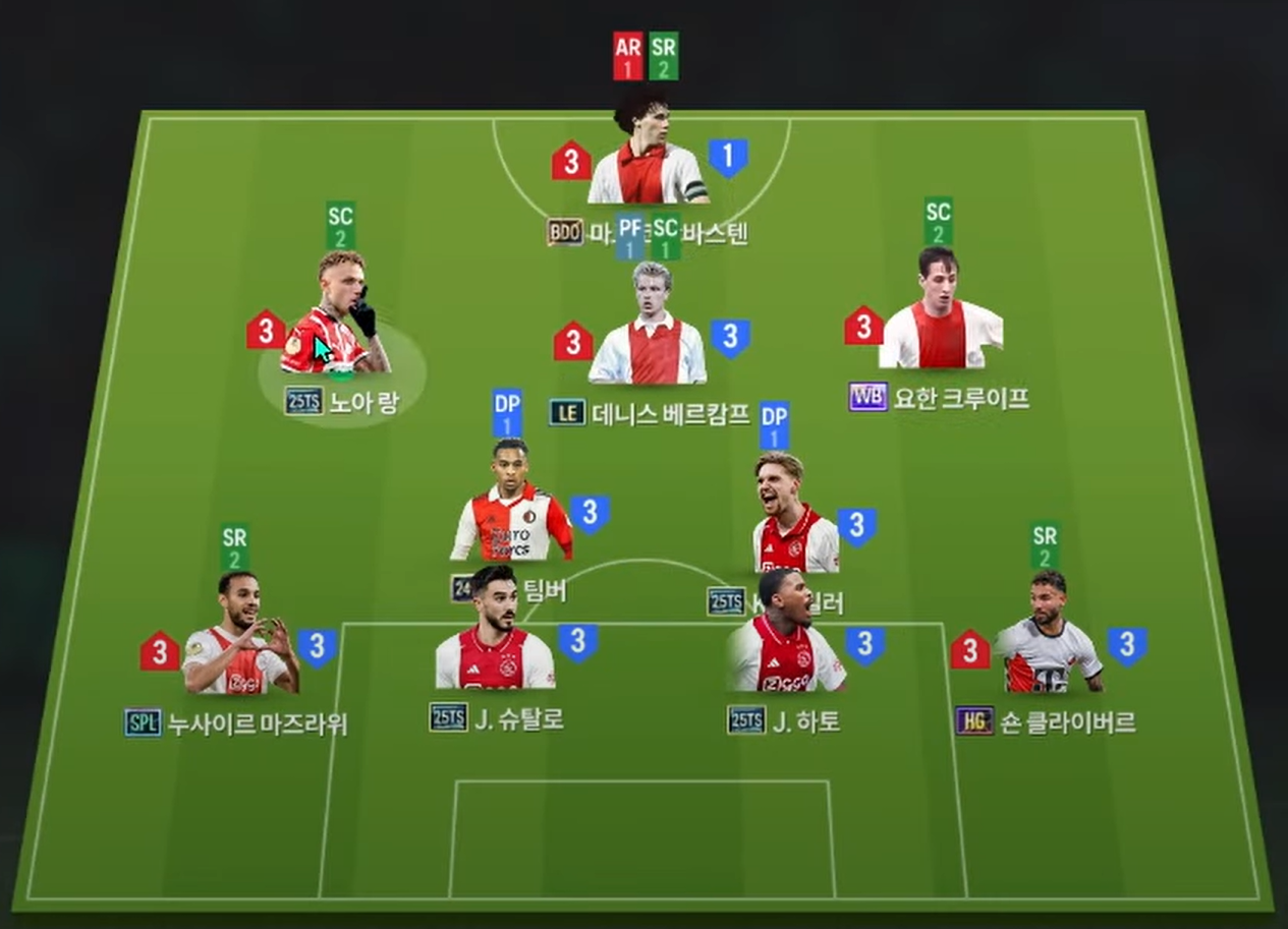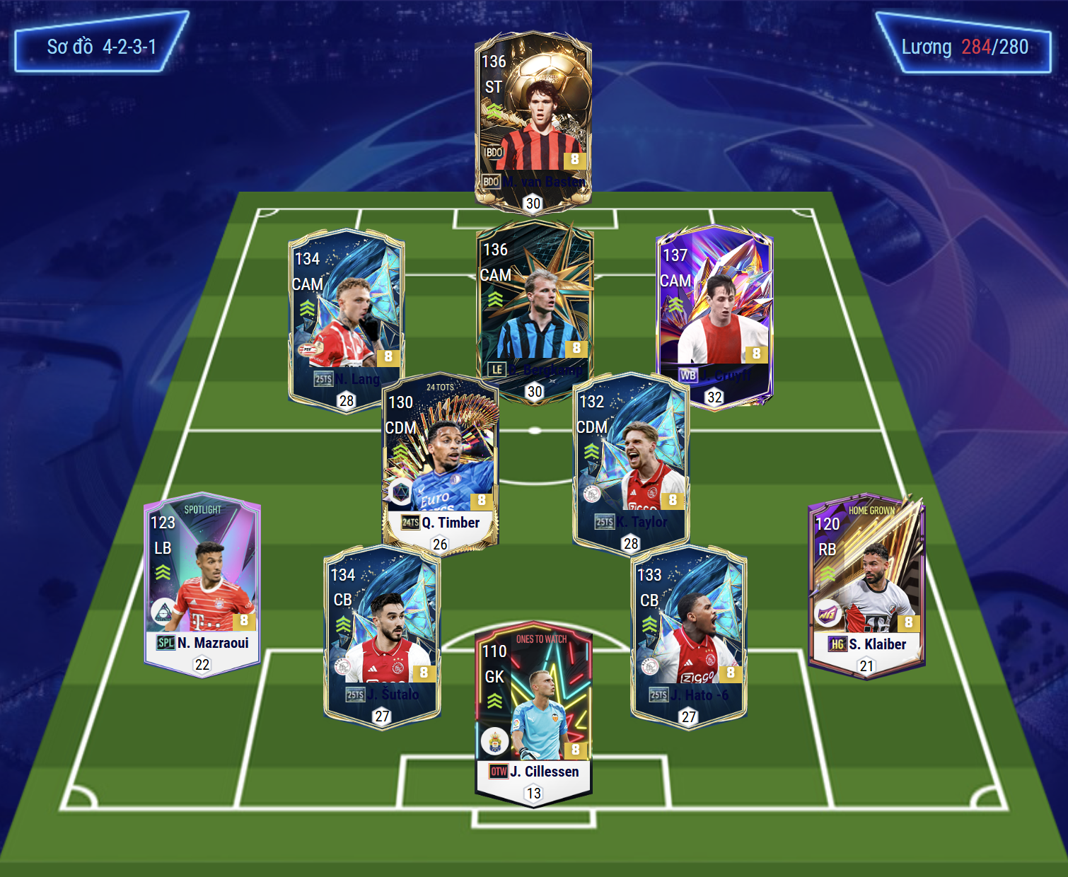 Bộ đôi tiền vệ phòng ngự Timber và Taylor là những cái tên được tin dùng bởi sự linh hoạt, khả năng thi đấu đa dạng từ chuyền bóng, hỗ trợ phòng ngự ban bật và xây dựng lối chơi đều ổn. Bộ tứ vệ với cặp hậu vệ biên Mazraoui và Klaiber sở hữu tốc độ tốt, khả năng tranh chấp và phòng ngự biên hiệu quả. Cặp trung vệ trẻ Hato và Sutalo sở hữu AI phòng ngự tốt, tắc bóng khôn rất phù hợp với meta hiện tại sẽ là lá chắn bảo vệ chất lượng cho khung thành của thủ môn Cillessen.