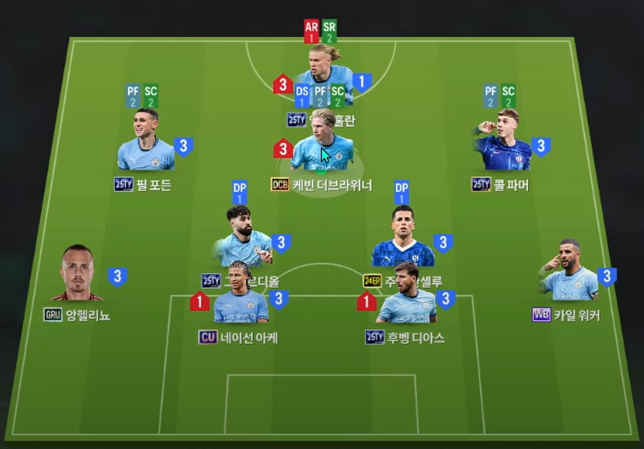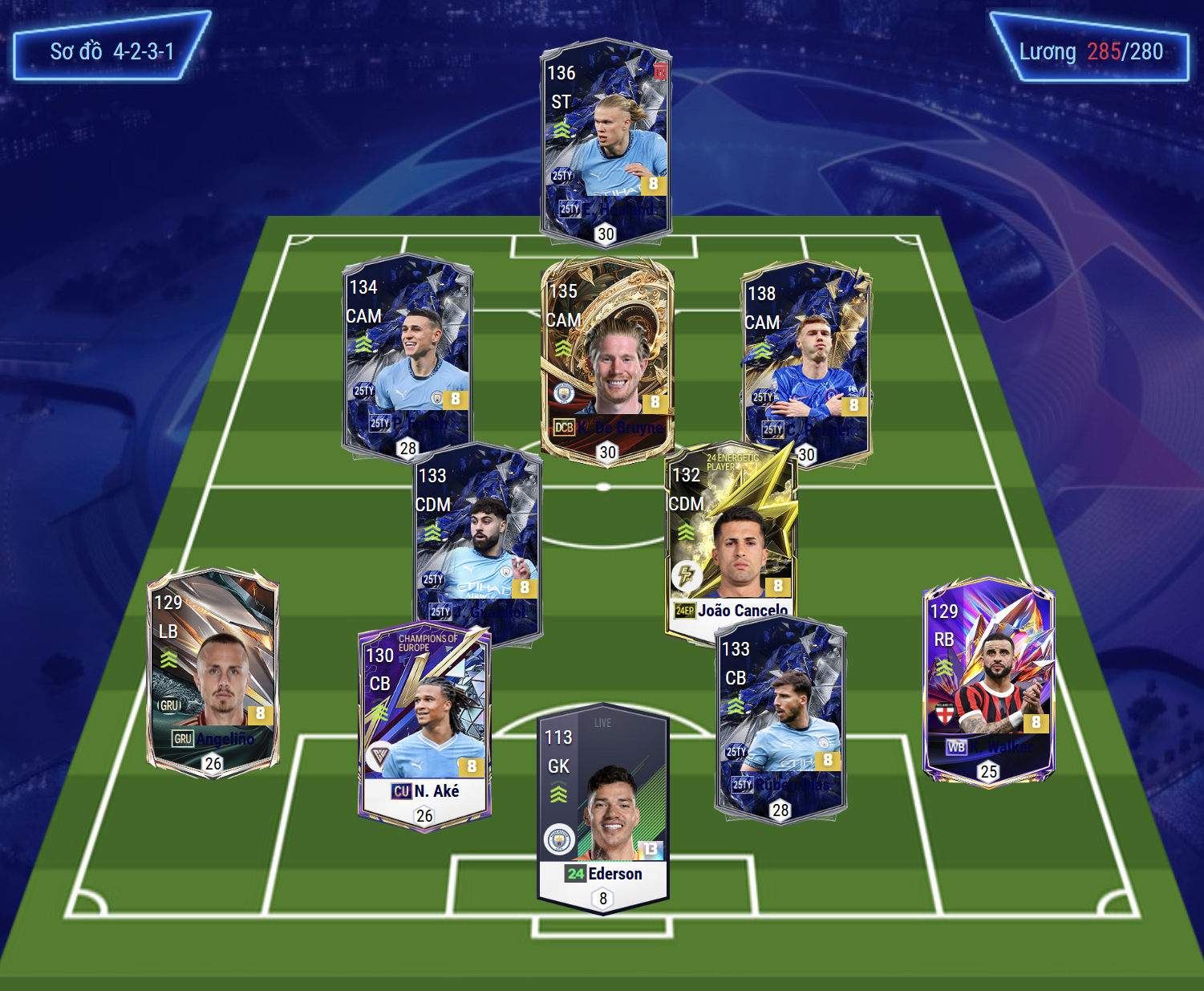 Sơ đồ 4231 là sơ đồ được lựa chọn cho team color Man City với vị trí chơi cao nhất trên hàng công là tiền đạo cắm được tin dùng là Haaland. Hỗ trợ phía dưới là bộ 3 tiền vệ tấn công LAM, CAM và RAM lần lượt là Foden, De Bruyne và Cole Palmer. Trong đó Foden và Palmer bám biên nhiều hơn trong khi đó De Bruyne sẽ đá như 1 hộ công khi vừa sở hữu khả năng chuyền bóng tốt lẫn sút xa ấn tượng.