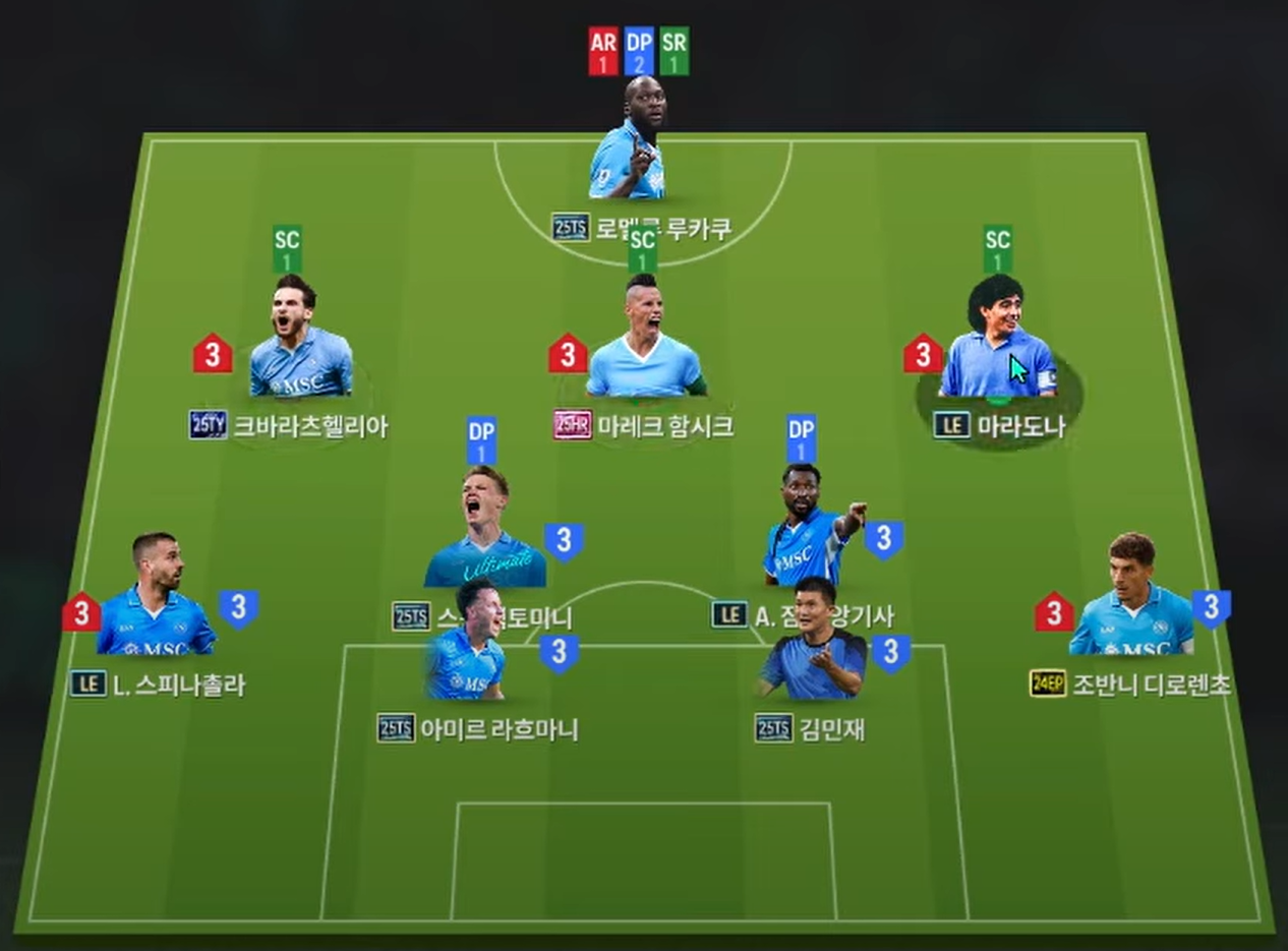 Sơ đồ được lựa chọn là 4231, dạng sơ đồ này sẽ tối ưu nhân lực của Napoli. Trong đó vị trí tiền đạo cắm là Lukaku, đây là một trong những tiền đạo tạo ra hiệu quả và đáng dùng ở thời điểm hiện tại của Napoli. Bộ 3 tiền vệ tấn công với Kvaratskhelia, Hamsik và Maradona, cả 3 đều là những mầu tiền vệ tấn công ấn tượng với Kvarat và Maradona sẽ có xu hướng bám cánh nhiều hơn trong khi Hamsik sẽ là cầu thủ hỗ trợ ở trung tâm hàng tấn công vừa chuyền bóng vừa sẵn sàng ghi bàn.