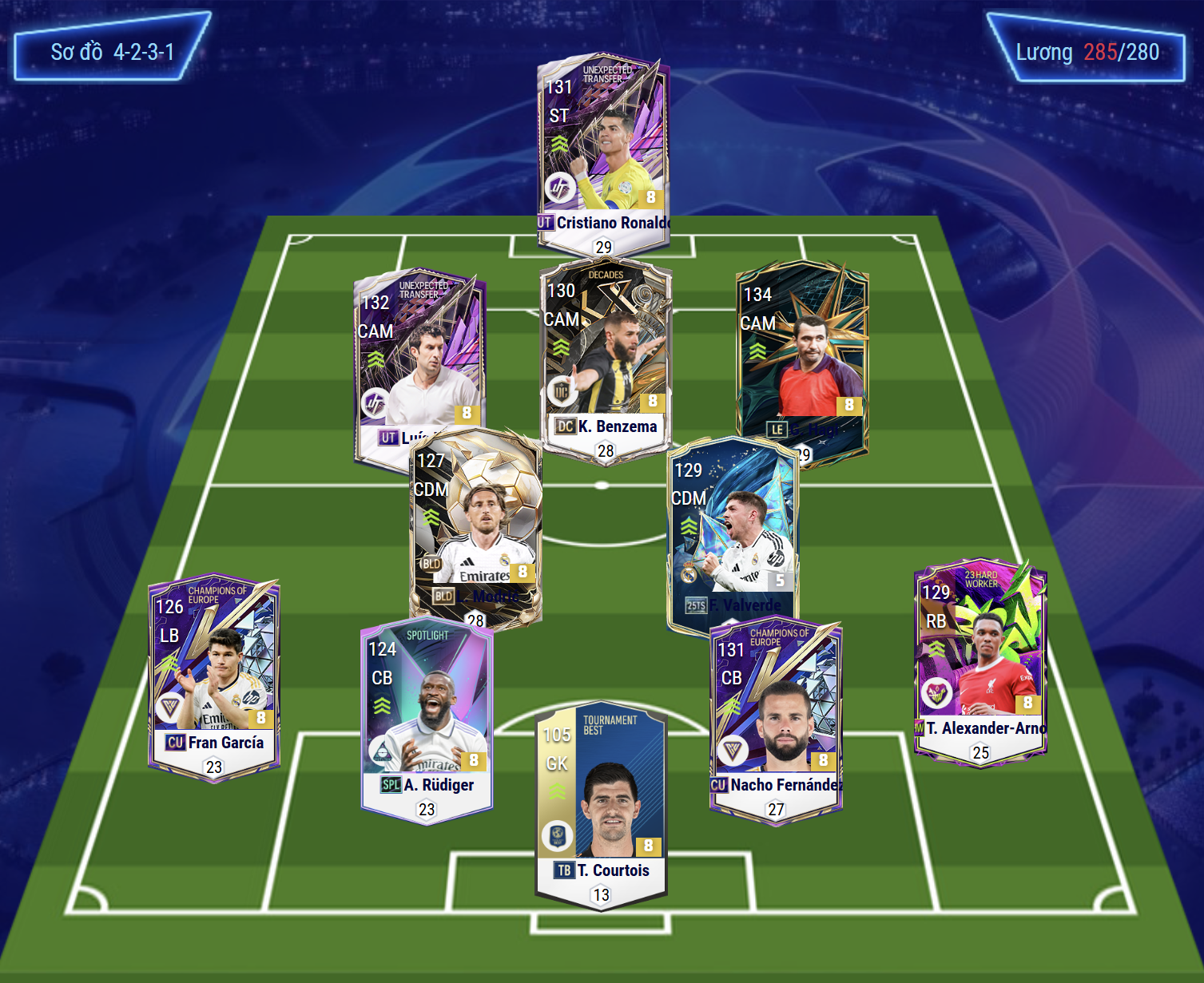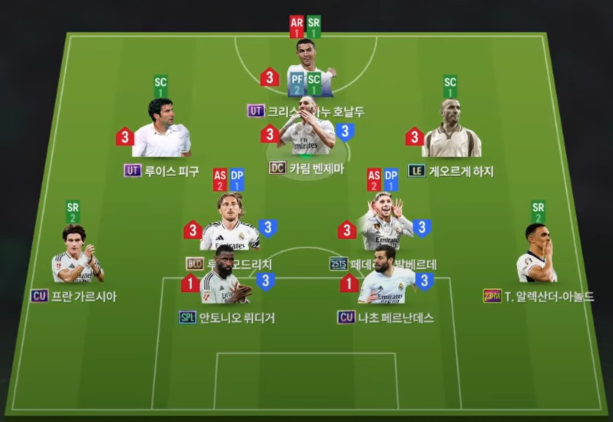 Sơ đồ 4231 được lựa chọn cho team color Real Madrid rất hợp với meta hiện tại. Vị trí tiền đạo cắm được lựa chọn là Cristiano Ronaldo, đây được xem là một trong những tiền đạo cắm toàn diện và đáng dùng hàng đầu. Hỗ trợ phía sau là bộ 3 tiền vệ tấn công Figo, Benzema và Hagi lần lượt cho 3 vị trí LAM, CAM, RAM. Cả 3 đều sở hữu kỹ năng chuyền tạt tốt, khả năng xâm nhập và dứt điểm hiệu quả ở cả 2 tuyến. Trong đó Hagi và Figo sẽ có xu hướng bám biên hơn trong khi Benzema lại tập trung nhiều ở khu vực trung tâm như 1 hộ công hỗ trợ cho CR7.