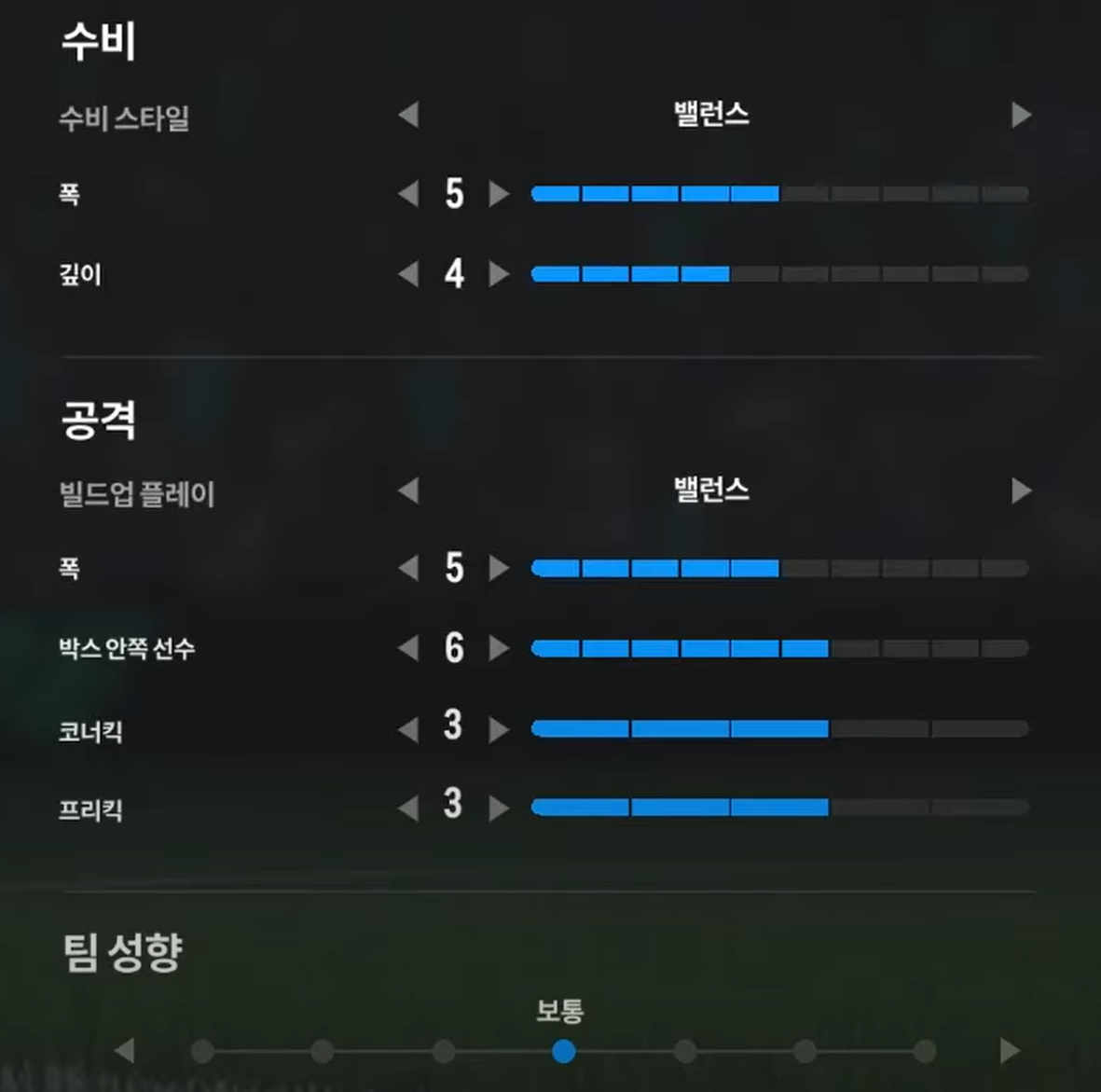 Trong khi, thiết lập tấn công "cân bằng" sẽ phù hợp cho lối chơi kiểm soát bóng, triển khai thế trận chậm, chắc ở tuyến giữa và ban bật với các vệ tinh trên hàng công để mở ra khoảng trống và ghi bàn. Ở lối chơi tấn công này, xu hướng triển khai sẽ là xu hướng chậm, chắc bóng và tìm kiếm cơ hội thay vì tấn công tổng lực và tốc độ cao.