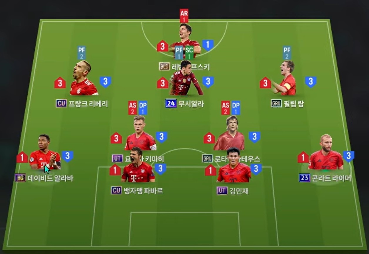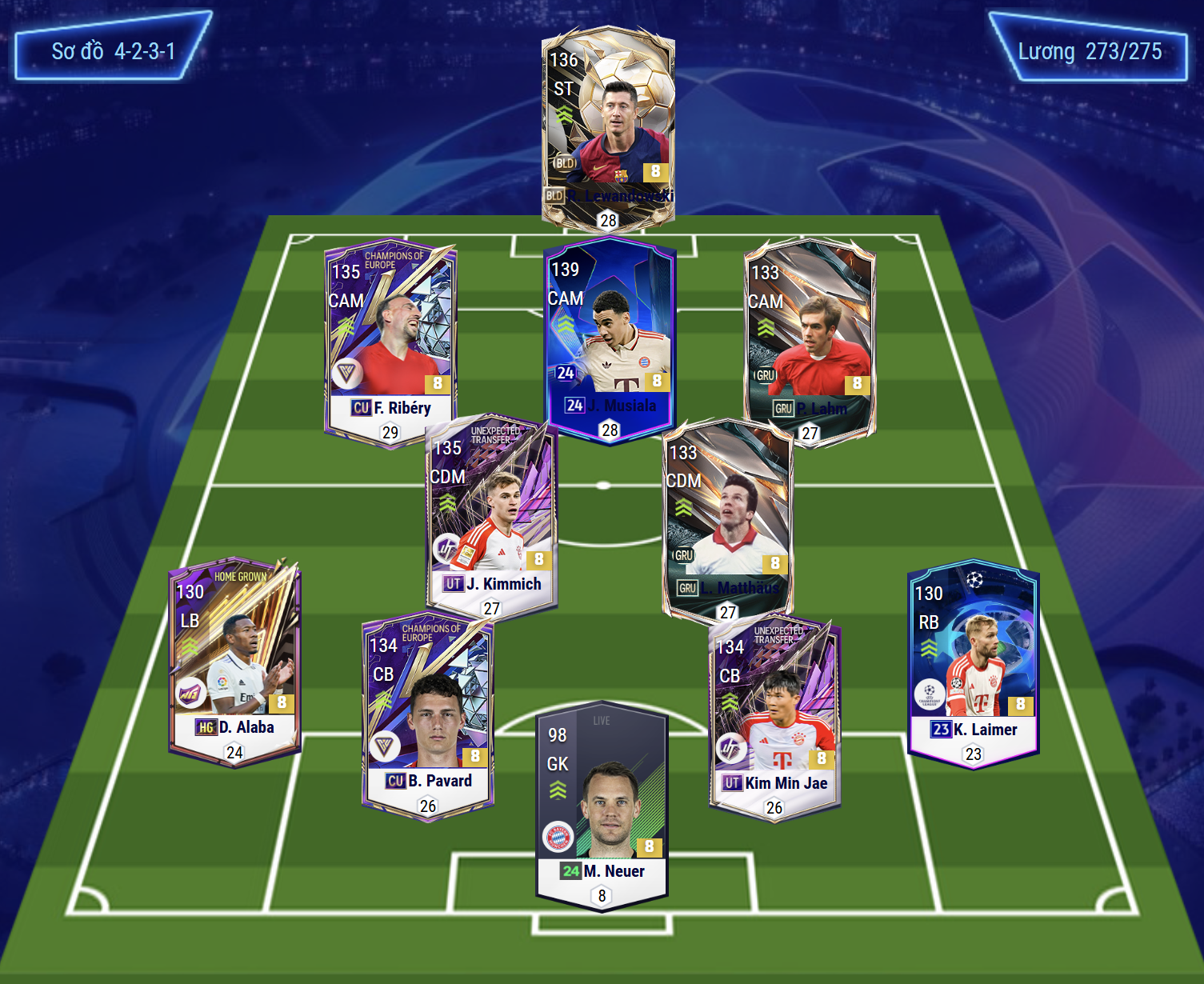 Sơ đồ 4231 được lựa chọn cho team color Bayern Munich với vị trí tiền đạo cắm được tin dùng là Lewandowski, một trong những tiền đạo xuất sắc và toàn diện hàng đầu game. Bộ 3 tiền vệ công phía dưới với vị trí trung tâm CAM là Musiala, cầu thủ người Đức sở hữu khả năng rê dắt cực kì ấn tượng. Cặp tiền vệ công lệch cánh lần lượt là Ribery và Lahm với LAM và RAM.