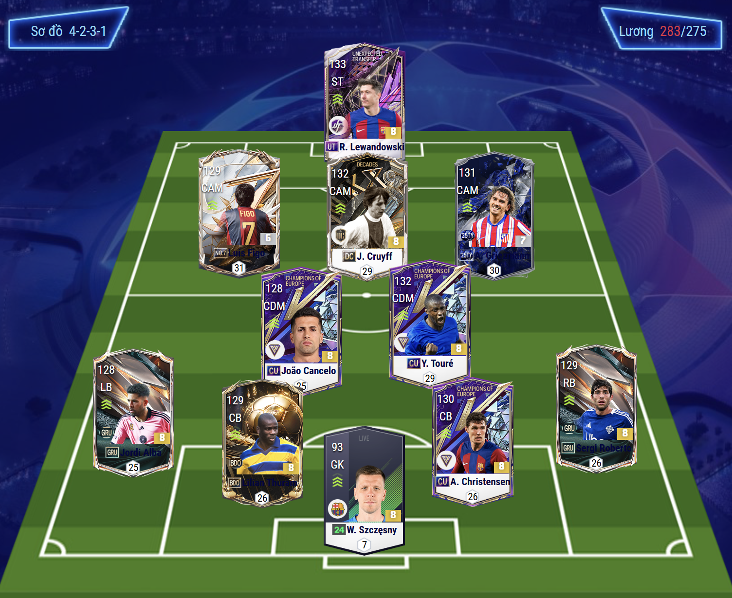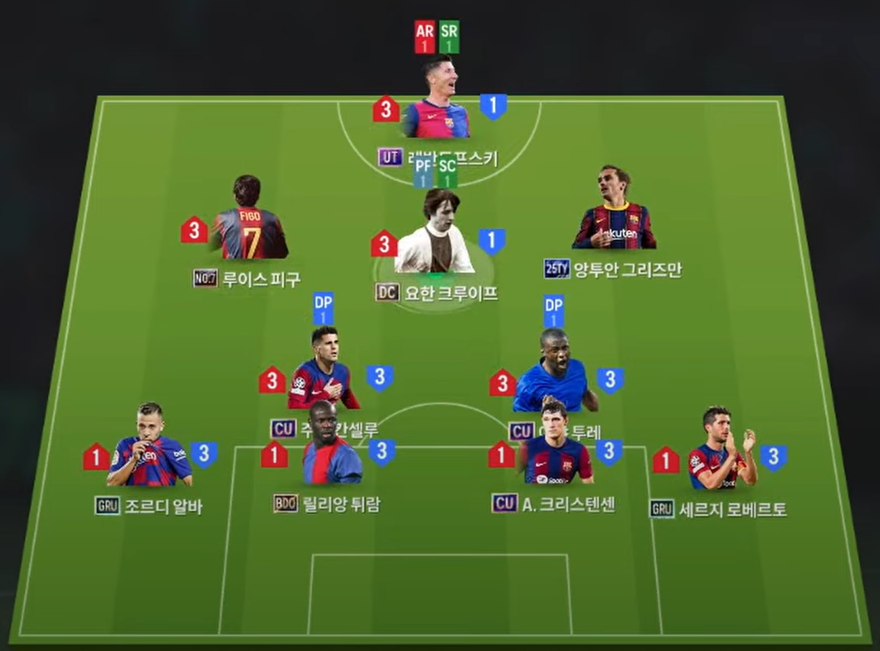 Sơ đồ 4231 được lựa chọn với vị trí tiền đạo cắm là Lewandowski, đây là một trong những mẫu trung phong toàn diện ở khả năng dứt điểm không chỉ của bằng chân mà còn là bằng đầu. Bộ 3 tiền vệ tấn công LAM, CAM và RAM lần lượt là Figo, Cruyff và Griezmann. Với Cruyff sẽ thi đấu ở khu vực trung tâm hỗ trợ trực tiếp cho tiền đạo cắm, trong khi đó LAM với RAM sẽ có xu hướng bám ra biên nhiều hơn.