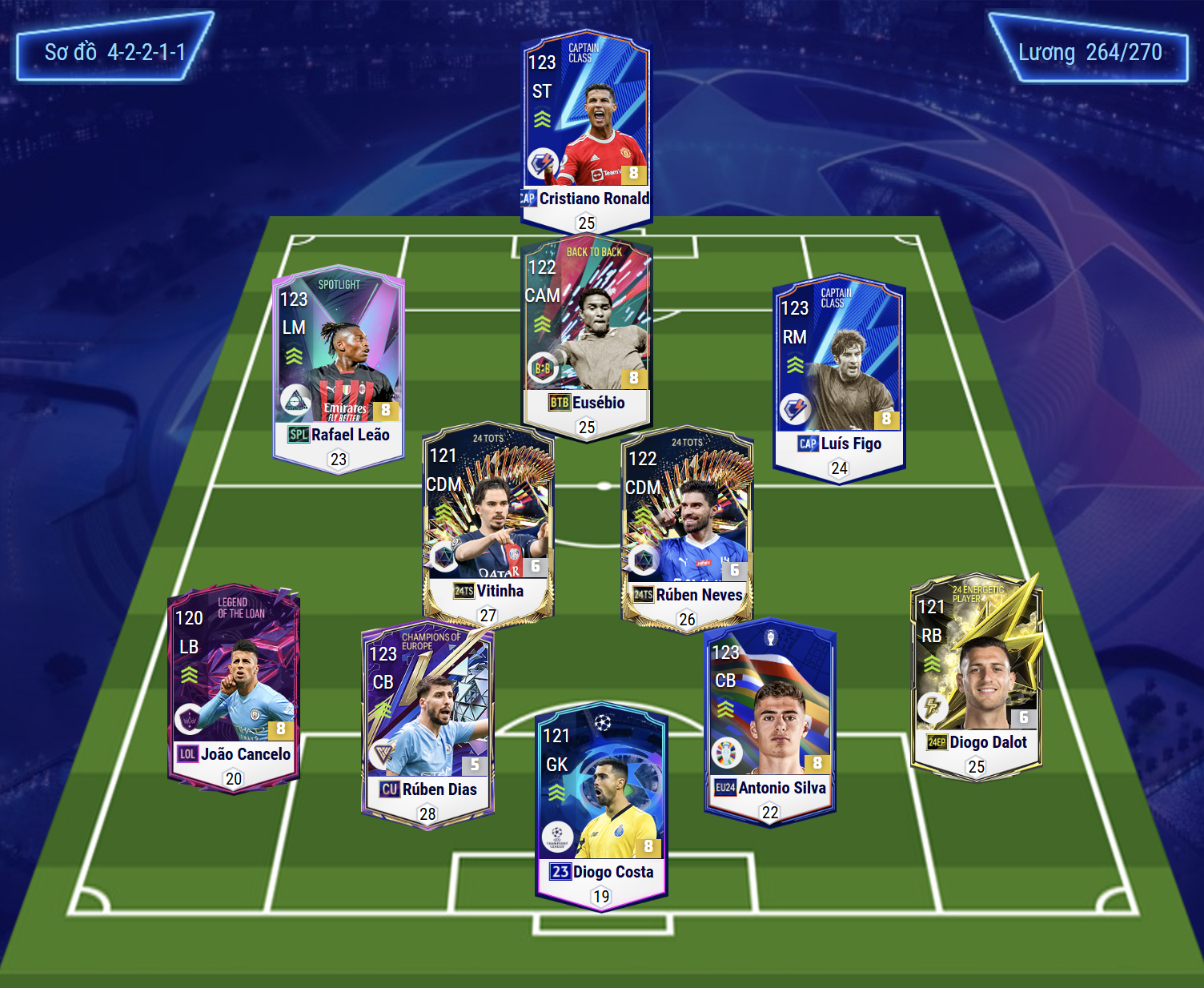 Sơ đồ 42211 với đầu tàu trên hàng công không ai khác chính là Cristiano Ronaldo. Hỗ trợ tấn công cho CR7 ở vai trò tiền vệ công chính là cụ Eusebio, cái tên quốc dân sở hữu lối chơi toàn diện nhưng lại ít được quan tâm quá nhiều do hạn chế về team color. Cặp đôi tiền vệ cánh đáng dùng chính là Leao và Figo ở thời điểm hiện tại.