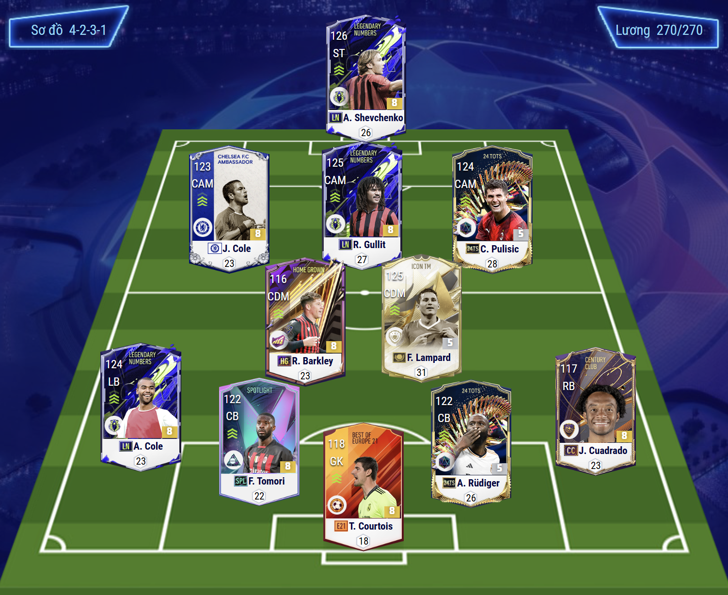 Sơ đồ 4231 với Shevchenko là cái tên chơi cao nhất trên hàng công. Bộ 3 tiền vệ công LAM, CAM và RAM lần lượt là Joe Cole, Gullit và Pulisic. Cả 3 cái tên kể trên đều sở hữu tốc độ tốt, khả năng chuyền và sút ấn tượng bằng cả 2 chân,