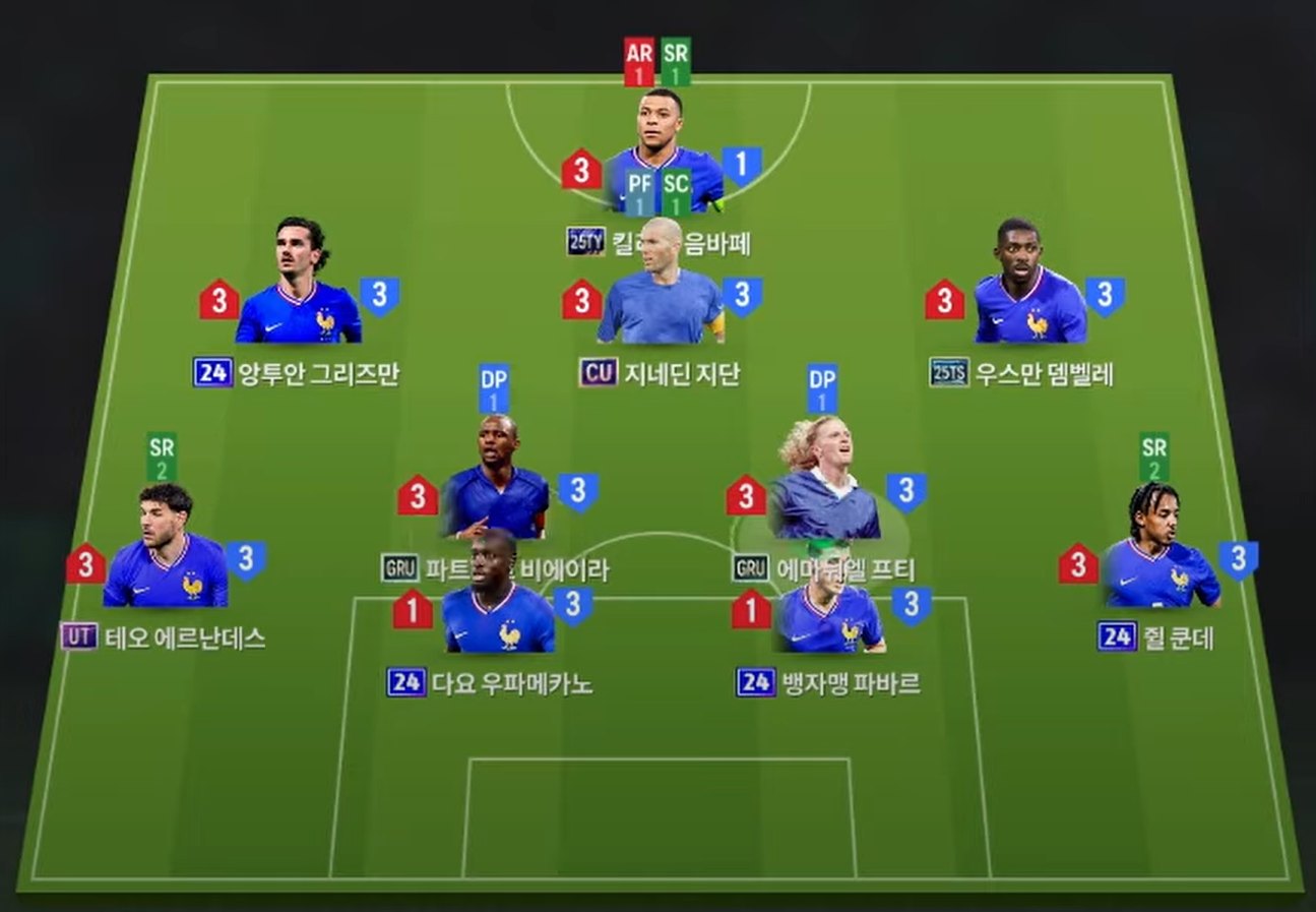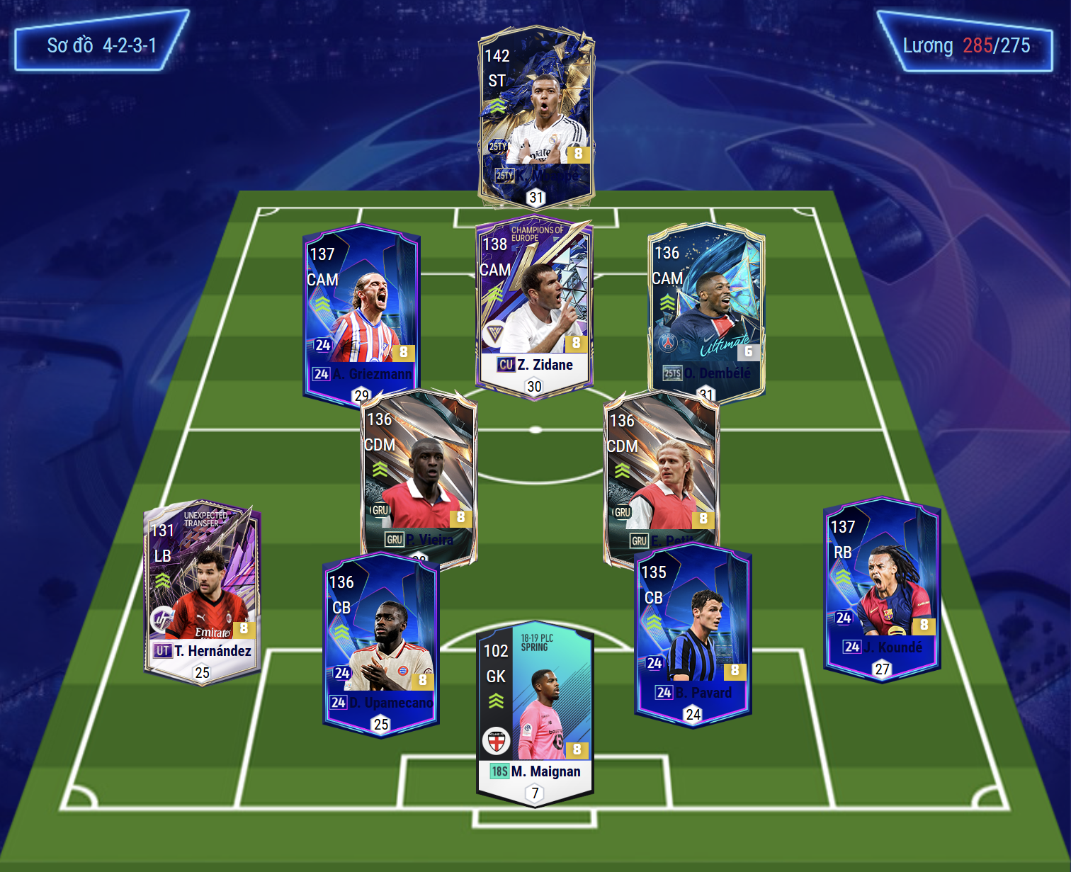 Vị trí tiền đạo cắm được tin dùng là Mbappe với tốc độ, AI di chuyển thông minh cùng khả năng dứt điểm đa dạng hiệu quả. Hỗ trợ phía sau là LAM, CAM và RAM lần lượt là Griezmann, Zidane và Dembele. 2 vị trí lệch cánh sẽ có xu hướng chơi bám biên nhiều hơn trong khi tiền vệ công trung tâm sẽ vừa làm nhiệm vụ hỗ trợ vừa tham gia ghi bàn.