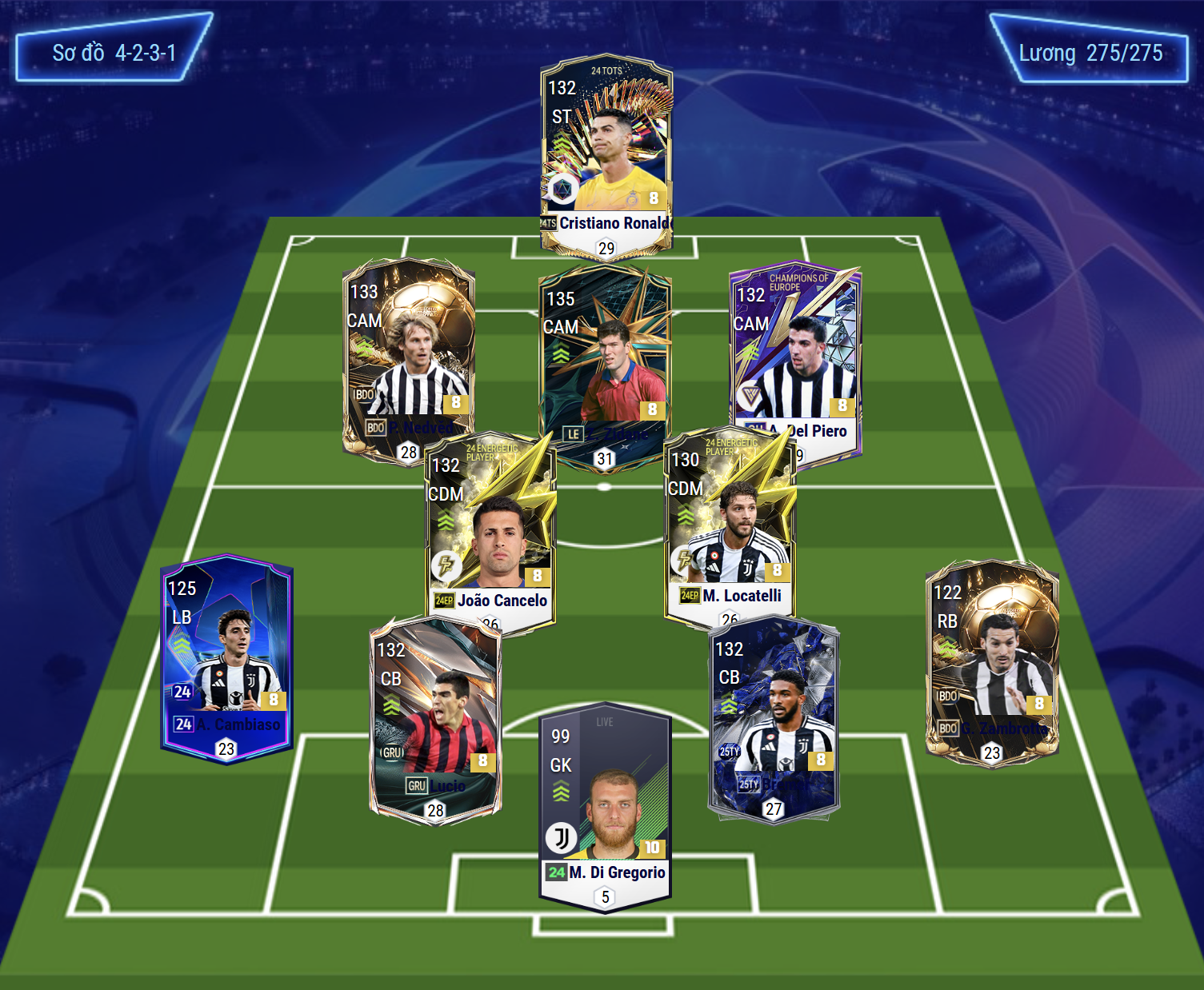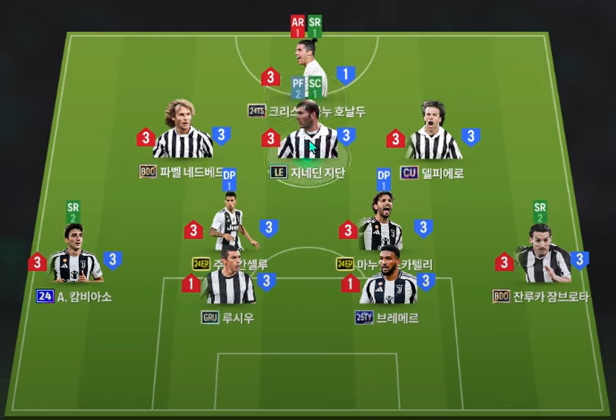 Sơ đồ 4231 của team color Juventus là dạng sơ đồ cơ bản, với vị trí tiền đạo cắm là Cristiano Ronaldo, một trong những tiền đạo toàn diện bậc nhất game thời điểm này. Bộ 3 tiền vệ tấn công của Juventus cũng được đánh giá là những cái tên quốc dân với Zidane thi đấu ở vị trí CAM trong khi Nedved và Del Piero sẽ có xu hướng thi đấu dạt biên nhiều hơn với tốc độ, kỹ năng chuyền bóng lẫn rê dắt ấn tượng.