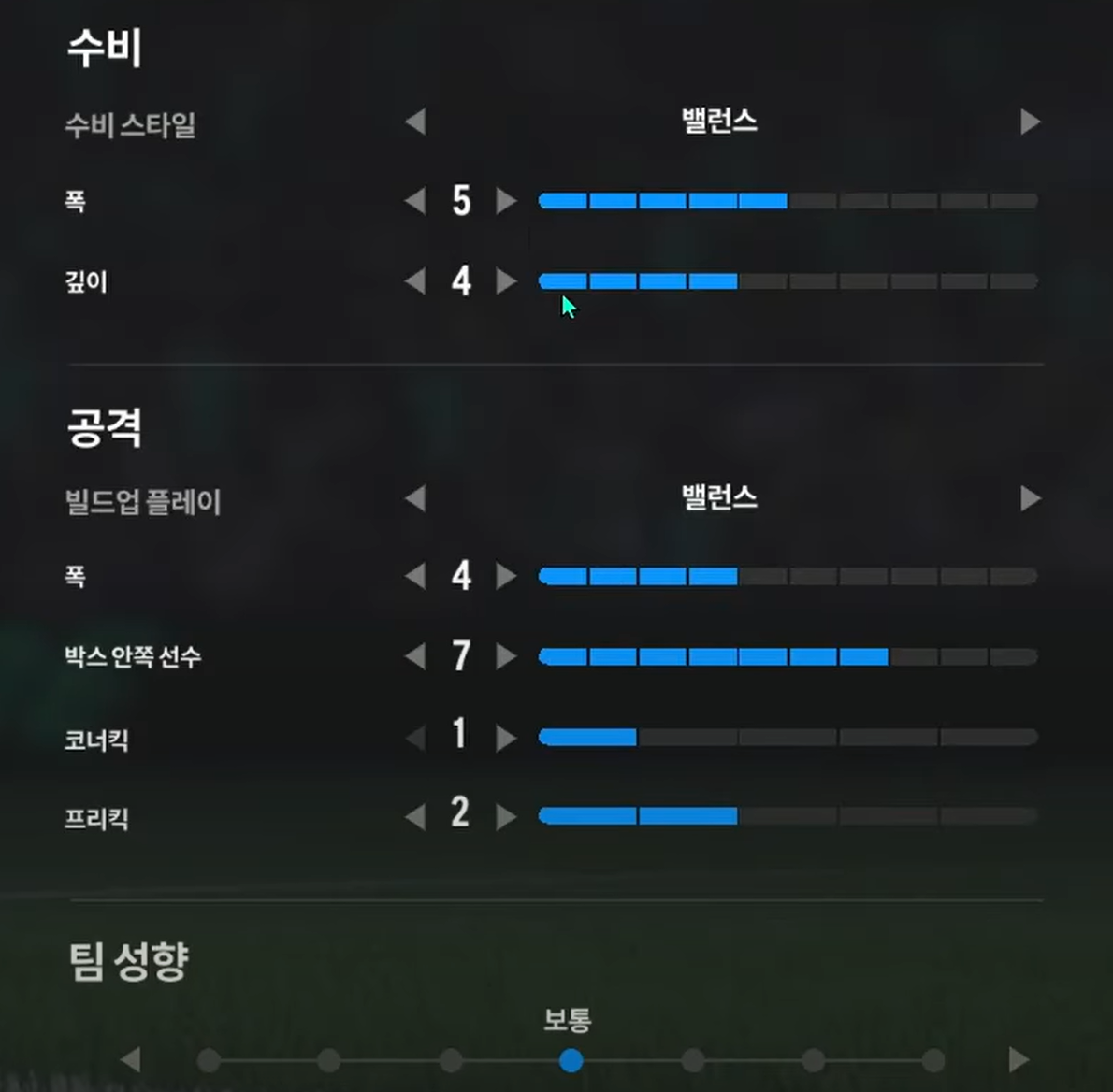 Trong khi, thiết lập tấn công "cân bằng" sẽ phù hợp cho lối chơi kiểm soát bóng, triển khai thế trận chậm, chắc ở tuyến giữa và ban bật với các vệ tinh trên hàng công để mở ra khoảng trống và ghi bàn. Ở lối chơi tấn công này, xu hướng triển khai sẽ là xu hướng chậm, chắc bóng và tìm kiếm cơ hội thay vì tấn công tổng lực và tốc độ cao.