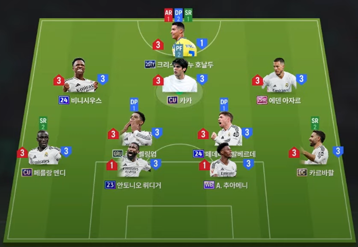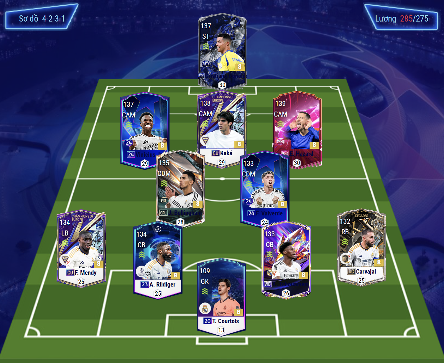 Sơ đồ 4231 được lựa chọn với vị trí tiền đạo cắm là Cristiano Ronaldo, một trong những tiền đạo toàn diện hàng đầu game hiện nay. Hỗ trợ phía sau là bộ 3 tiền vệ tấn công LAM, CAM và RAM lần lượt cho 3 cái tên Vinicius, Kaka, Hazard. Trong đó Kaka sẽ đá ở trung lộ còn cặp cầu thủ lệch cánh Vinicius và Hazard sở hữu tốc độ và khả năng chuyền sút ấn tượng.