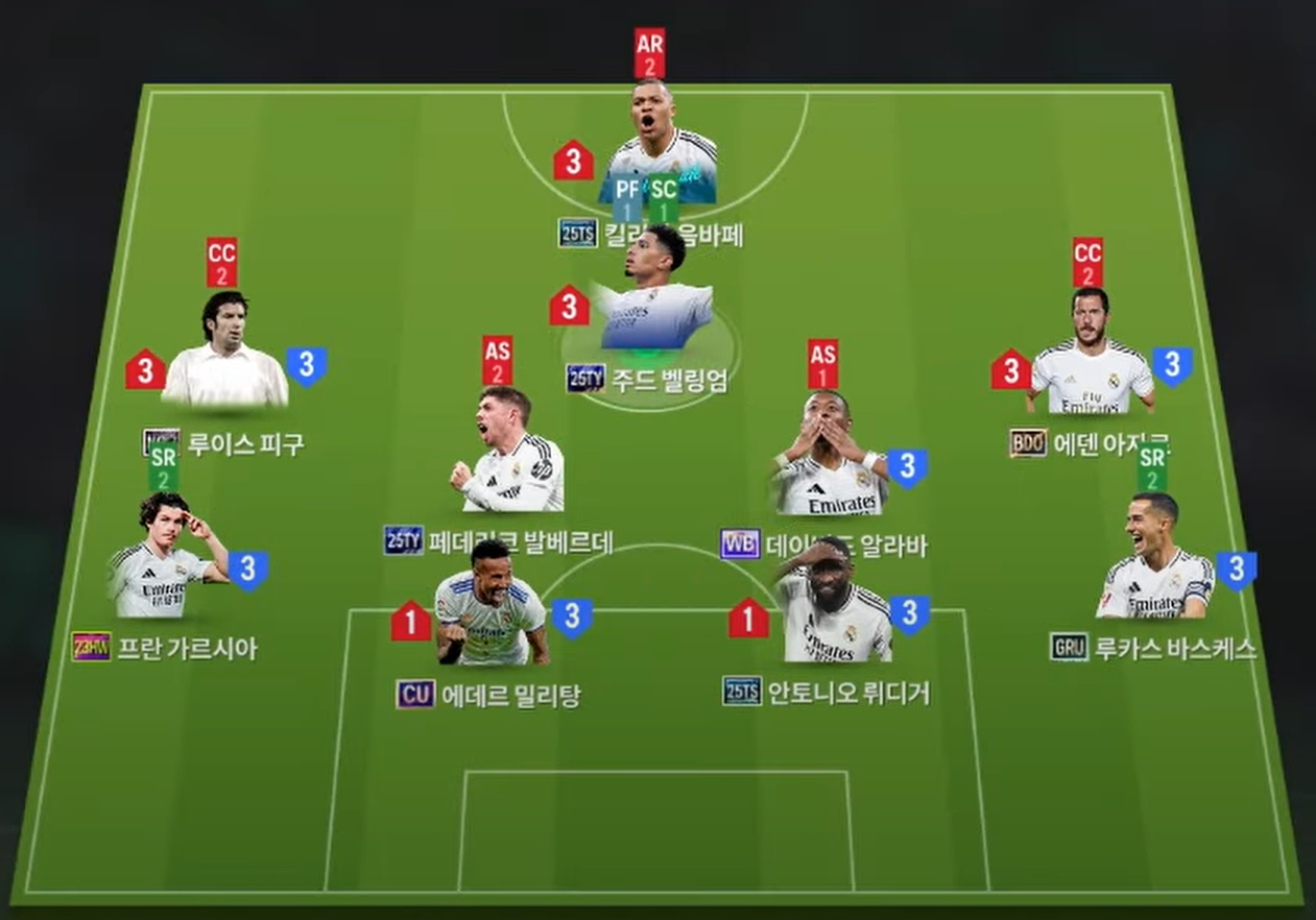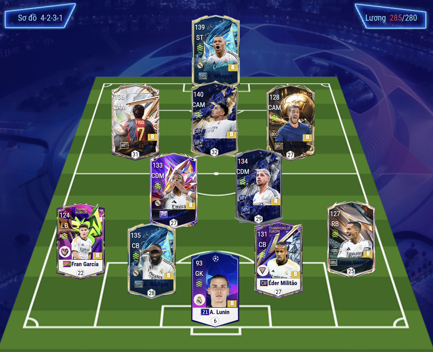 Sơ đồ 4231 được lựa chọn với vị trí chơi cao nhất trên hàng công là Mbappe, đây là một trong những tiền đạo hiệu quả bậc nhất FC Online meta hiện tại. Bộ 3 tiền vệ tấn công gồm Figo, Bellingham và Hazard lần lượt cho 3 vị trí LAM, CAM và RAM. Trong đó Figo và Hazard sẽ có xu hướng bám cánh nhiều hơn trong khi Bellingham sẽ là hỗ trợ chính cho vị trí tiền đạo phía trên.
