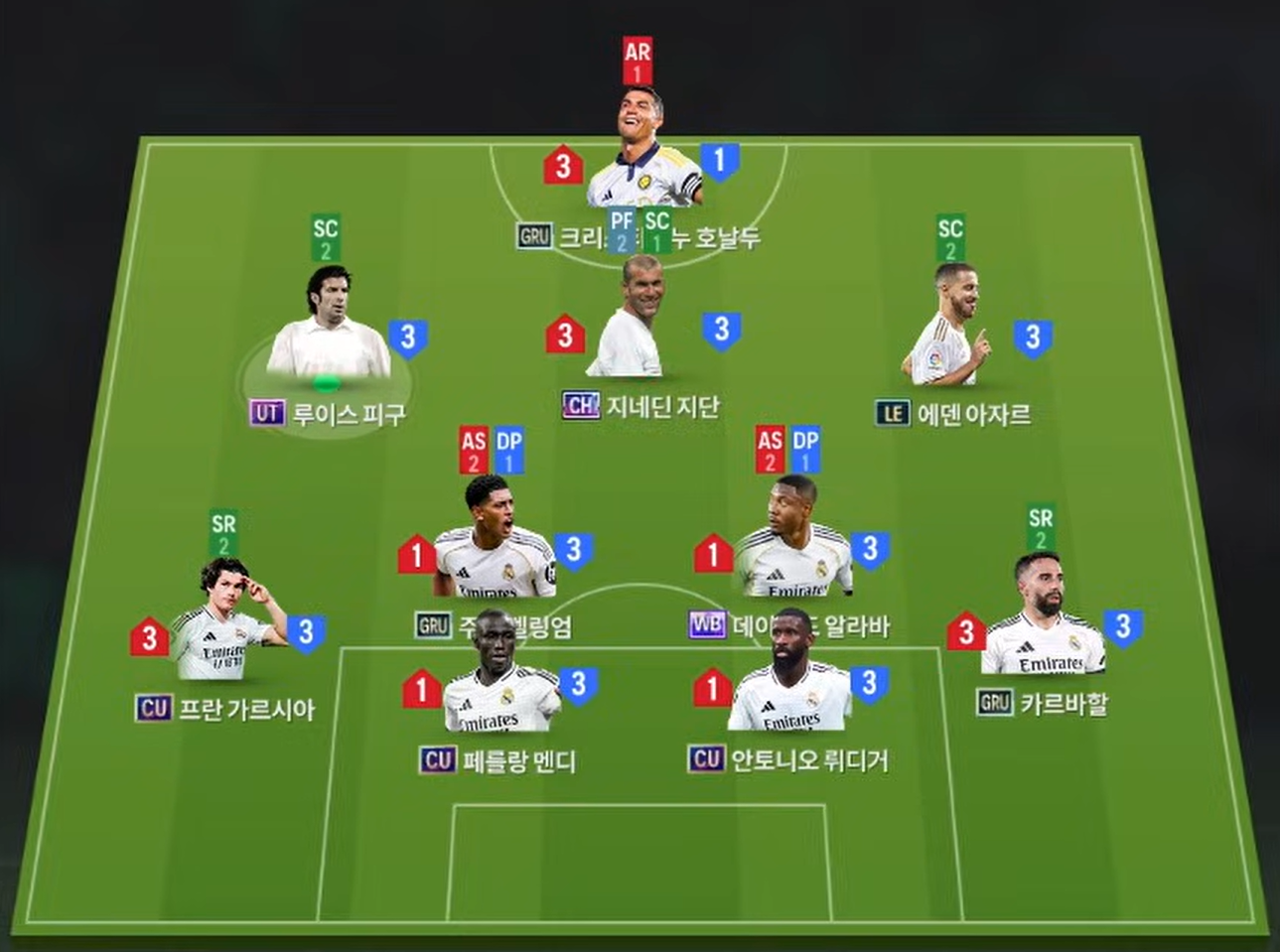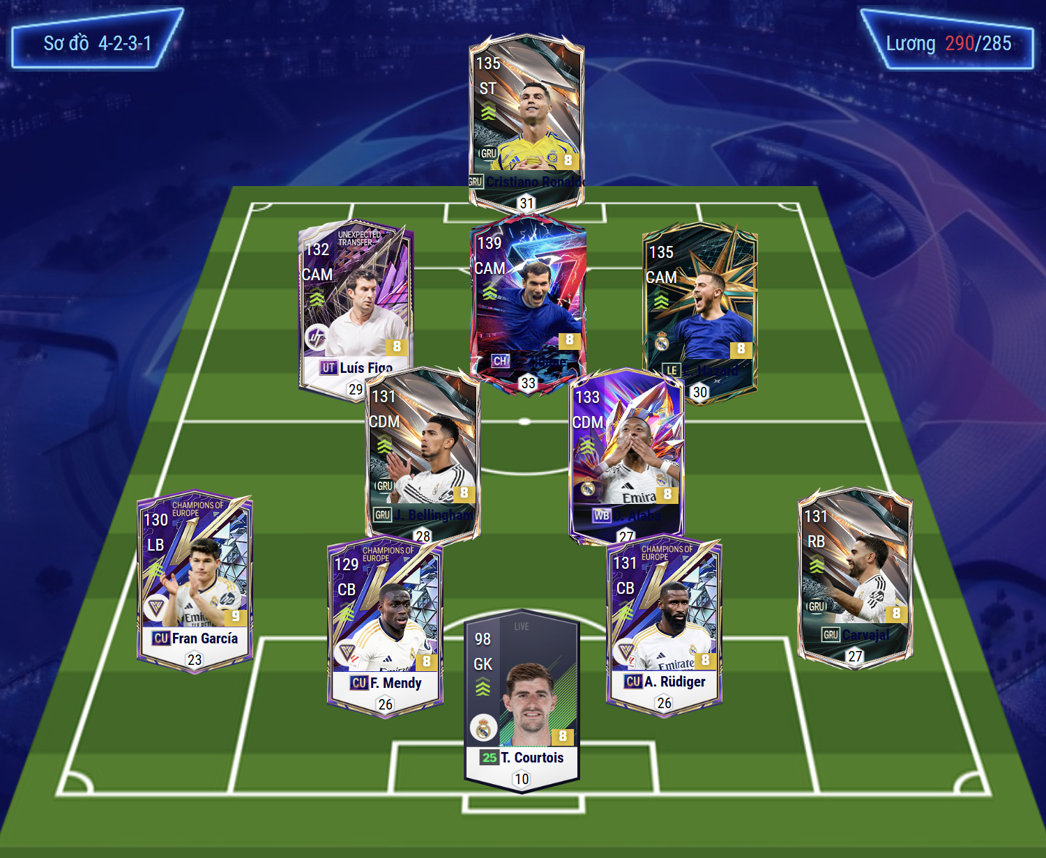 Sơ đồ 4231 được lựa chọn với vị trí tiền đạo cắm là Cristiano Ronaldo, một trong những trung phong cắm toàn diện và được tin dùng nhất hiện tại. Cầu thủ người Bồ sở hữu khả năng dứt điểm đa năng, kỹ năng rê dắt xử lý bóng tốt, không chiến hiệu quả cùng AI di chuyển nổi bật. Hỗ trợ phía sau là bộ 3 tiền vệ tấn công Figo, Zidane và Hazard lần lượt cho 3 vị trí LAM, CAM và RAM trong đó Figo và Hazard sẽ có xu hướng bám biên nhiều hơn còn Zidane lại cho thấy khả năng chuyền bóng, hỗ trợ sút xa tuyến 2 đều rất hiệu quả.