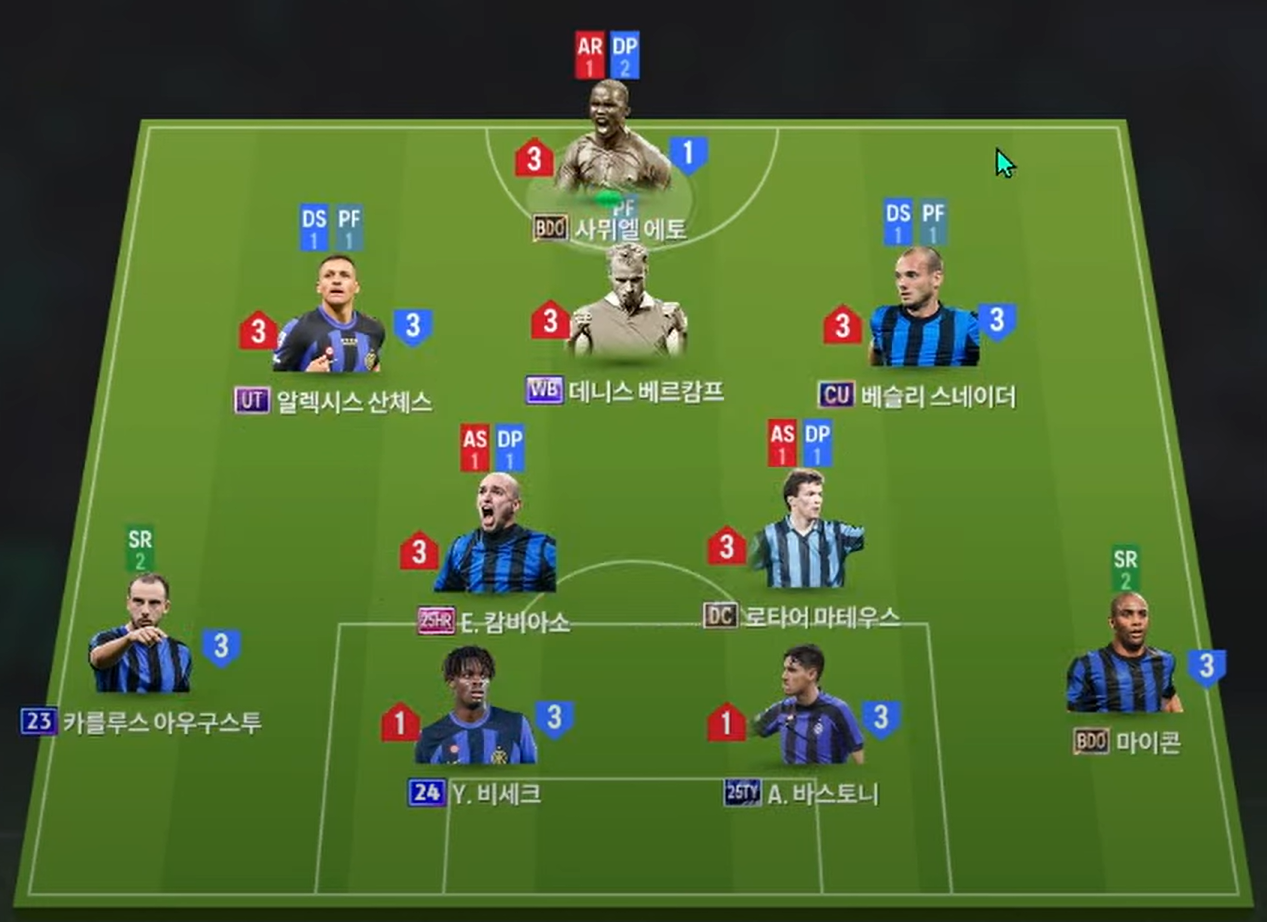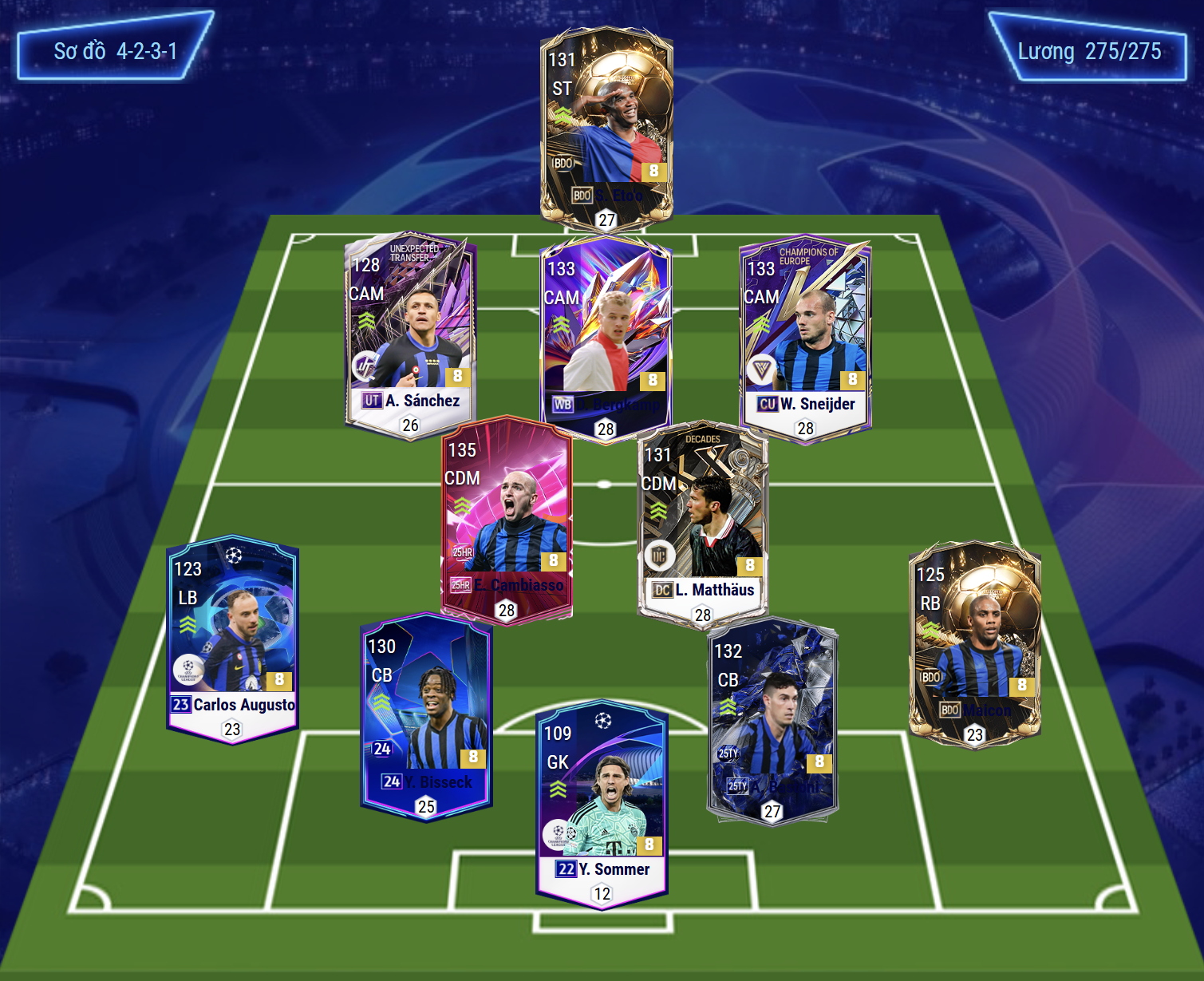 Sơ đồ 4231 với vị trí tiền đạo cắm được sử dụng là Eto'o, một trong những tiền đạo nhanh nhẹn, có AI di chuyển thông minh phù hợp cho meta hiện tại. Bộ 3 tiền vệ công LAM, CAM và RAM lần lượt là 3 cái tên Sanchez, Bergkamp và Sneijder. Cả 3 đều cho thấy hiệu quả hỗ trợ tấn công nổi bật từ khả năng chuyền bóng, sút xa cho đến di chuyển phối hợp.