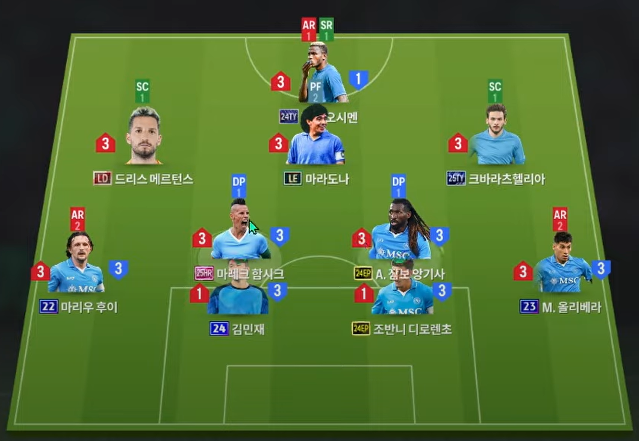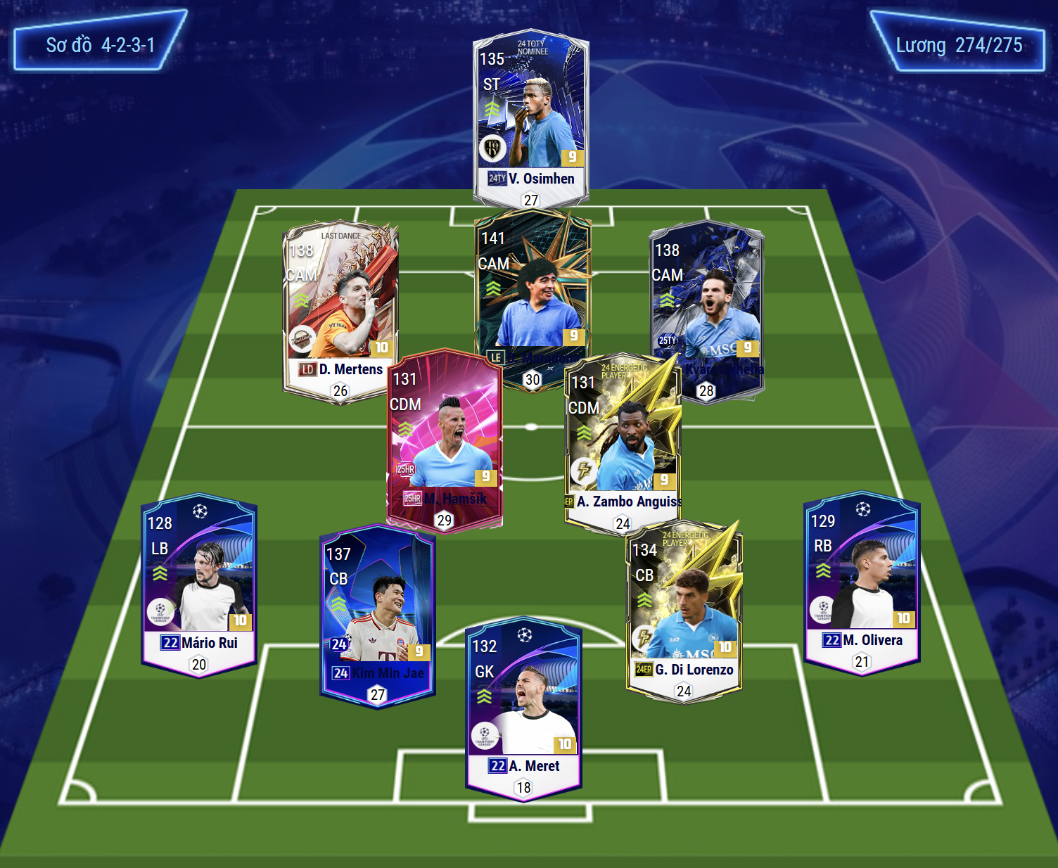 Sơ đồ 4231 được lựa chọn với vị trí tiền đạo cắm là Osimhen, cầu thủ sở hữu thể hình, tốc độ lẫn khả năng dứt điểm khá ấn tượng. Bộ 3 tiền vệ tấn công với 2 tiền vệ công lệch cánh là Mertens và Kvaratskhelia thi đấu như vị trí chạy cánh, sở hữu tốc độ tốt, khả năng chuyền tạt lẫn sút bóng hiệu quả. Tiền vệ công trung tâm CAM được lựa chọn là Maradona, huyền thoại của bóng đá Argentina.