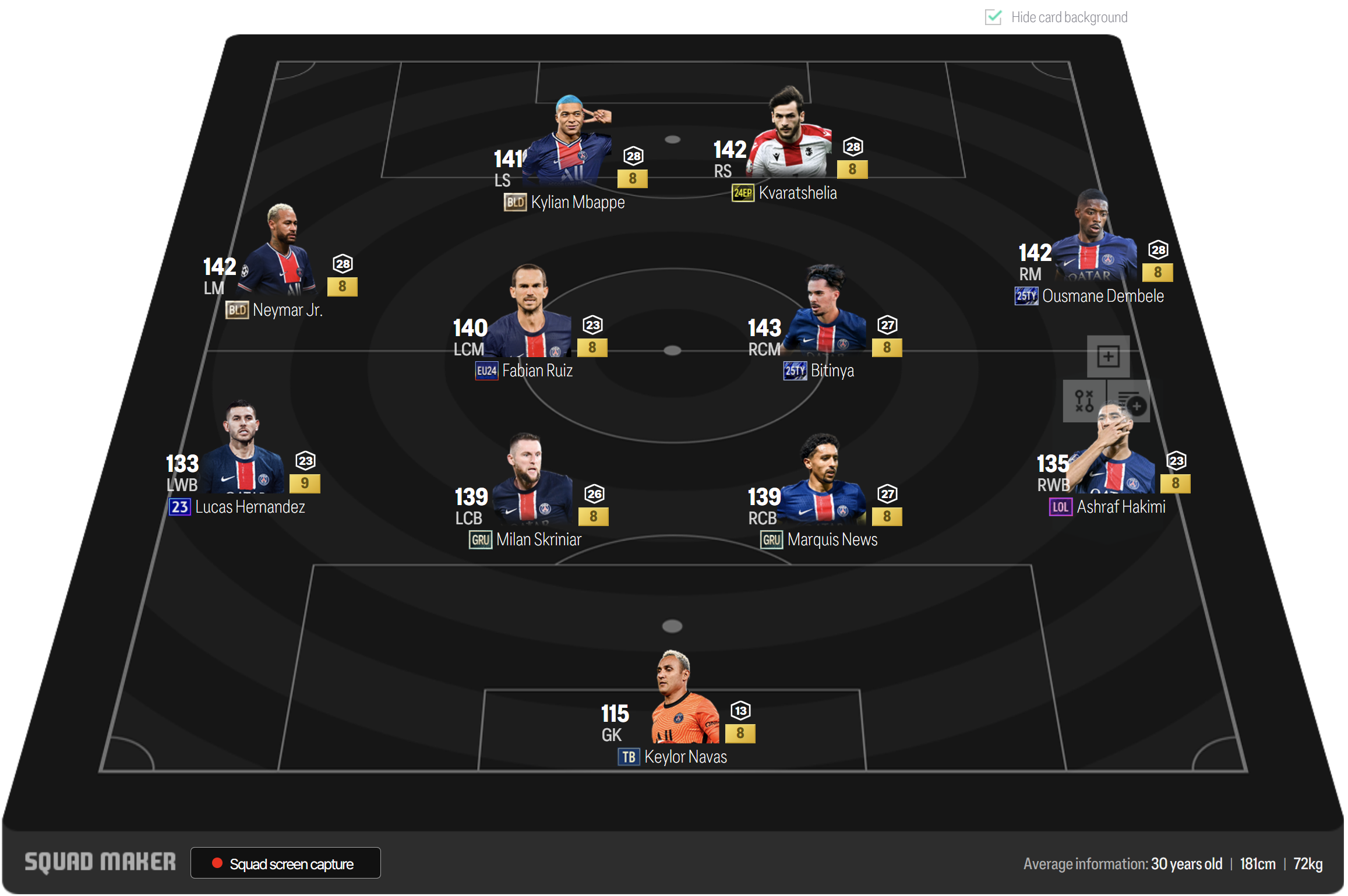Sơ đồ 442 với cặp tiền đạo cắm cực chất lượng là Mbappe và Kvaratskhelia. Cả 2 đều sở hữu kỹ năng dứt điểm tốt, tốc độ nhanh nhẹn và AI di chuyển thông minh. Cặp tiền vệ cánh với Neymar và Dembele được xem là cực kì tối ưu thời điểm hiện tại.