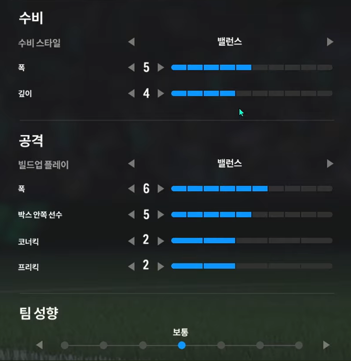 Trong khi, thiết lập tấn công "cân bằng" sẽ phù hợp cho lối chơi kiểm soát bóng, triển khai thế trận chậm, chắc ở tuyến giữa và ban bật với các vệ tinh trên hàng công để mở ra khoảng trống và ghi bàn. Ở lối chơi tấn công này, xu hướng triển khai sẽ là xu hướng chậm, chắc bóng và tìm kiếm cơ hội thay vì tấn công tổng lực và tốc độ cao.