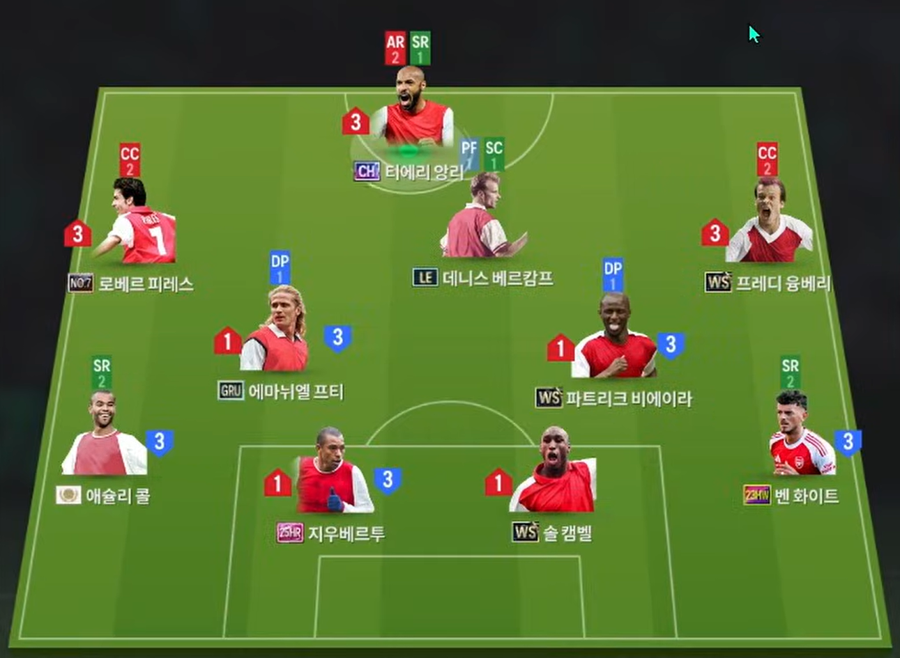 Sơ đồ 42211 được lựa chọn là một dạng biến tấu gần giống với sơ đồ 4222 Invincibles mà Arsenal đã từng sử dụng mùa 2003-2004. Với vị trí tiền đạo cắm được lựa chọn là Henry, con trai thần gió sở hữu tốc độ, khả năng dứt điểm đa dạng cùng kỹ năng xử lý bóng ấn tượng. Hỗ trợ phia sau anh là cặp bài trùng Bergkamp, một cái tên cực kì đa năng khi vừa sở hữu khả năng chuyền bóng tốt vừa cho thấy AI di chuyển cùng kỹ năng ghi bàn ấn tượng.