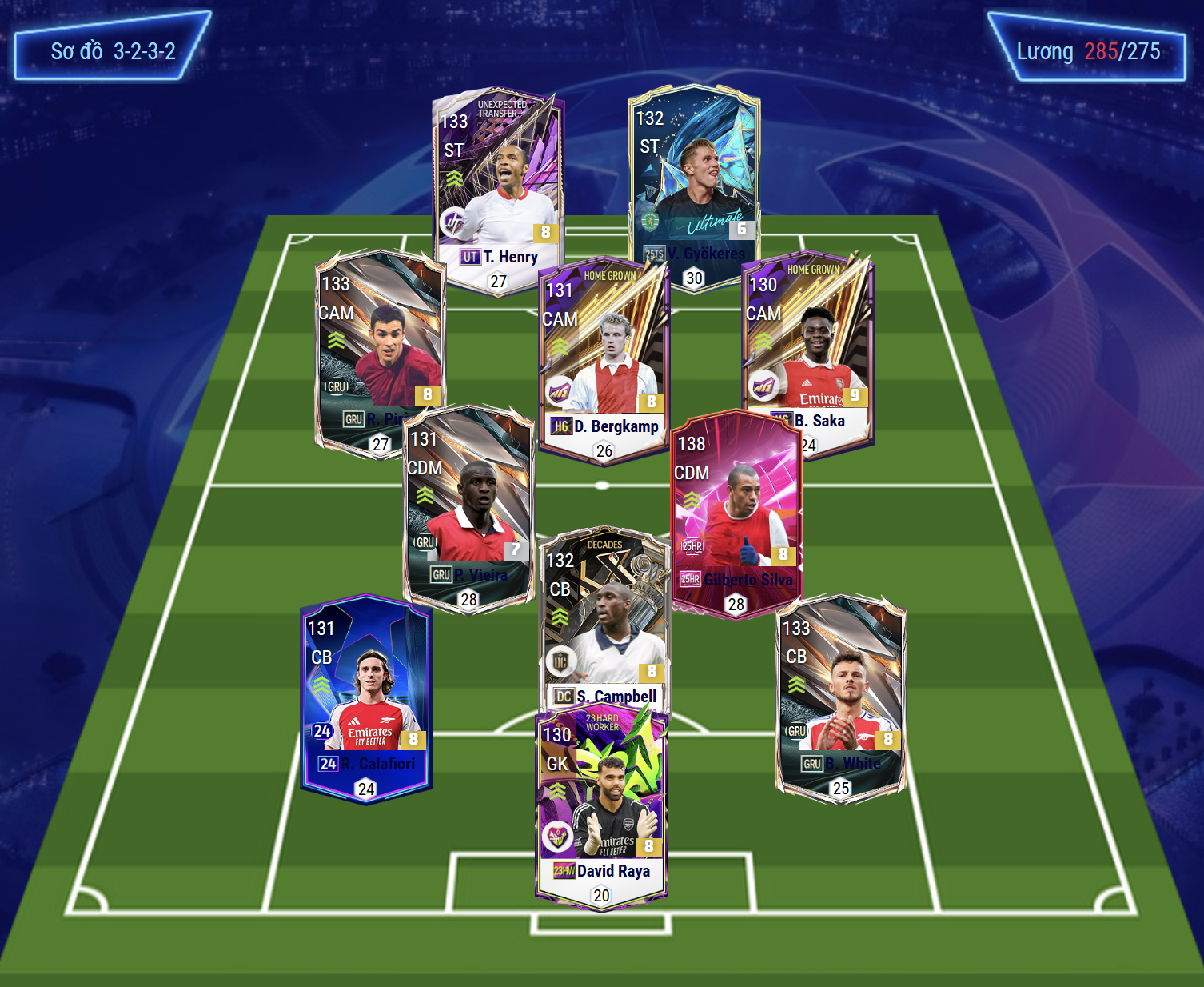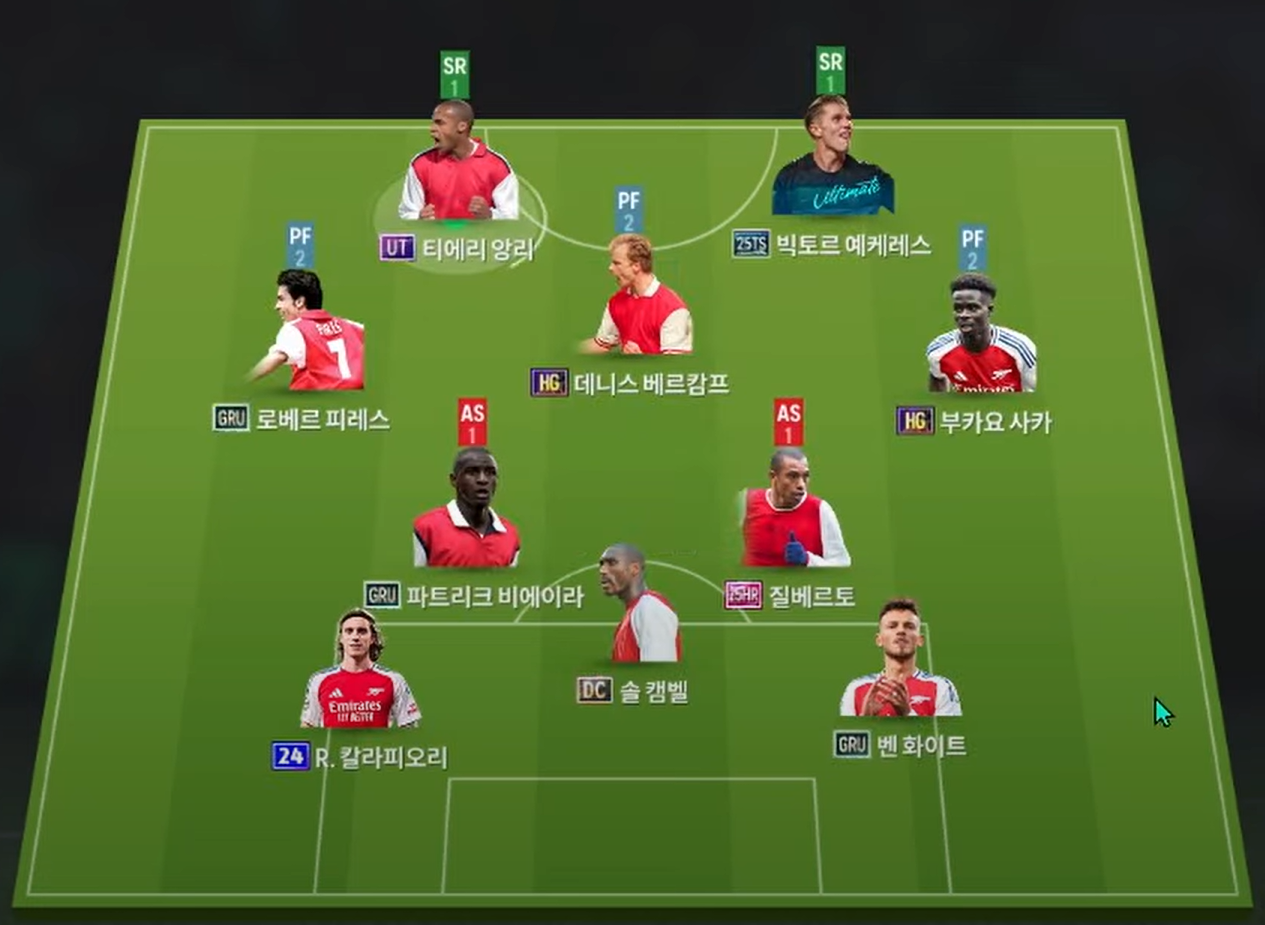 Sơ đồ 3232 được sử dụng là dạng sơ đồ khá mới mẻ nhưng cũng có những hiệu quả nhất định. Cặp tiền đạo cắm chơi cao nhất trên hàng công với Henry và Gyokeres, với Henry là cầu thủ có lối chơi tốc độ thì Gyokeres lại có khả năng làm tường cũng không chiến ấn tượng. Bộ 3 tiền vệ công lần lượt là Pires, Bergkamp và Saka lần lượt ở 3 vị trí LAM, CAM và RAM.