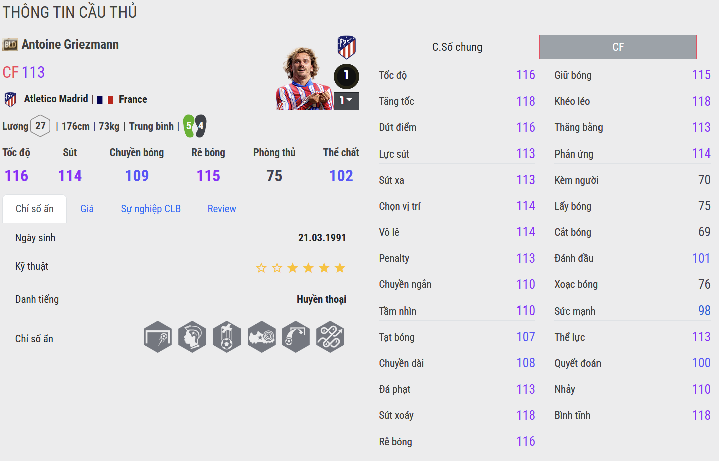 Griezmann còn sở hữu tốc độ khá, chuyền bóng tốt và khả năng không chiến ấn tượng, phù hợp với cả lối đá kiểm soát bóng lẫn phản công nhanh. Những mùa thẻ như 25TY, 24TS, 23UCL... đều có chỉ số cao, giúp anh trở thành lựa chọn lý tưởng cho hàng công trong FC Online.