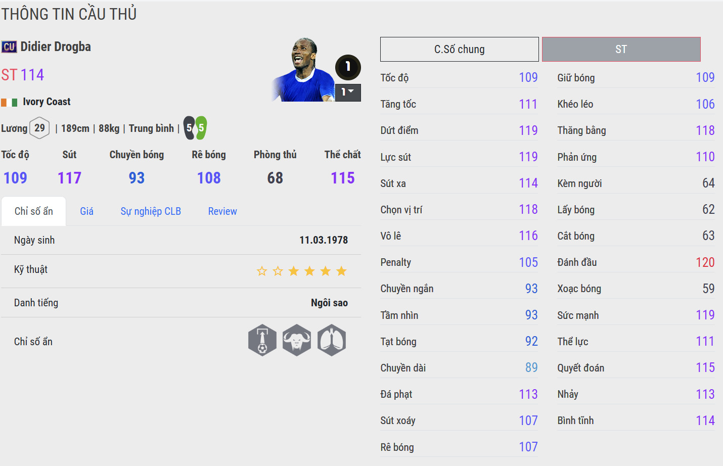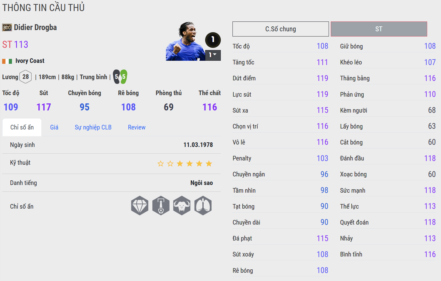 Với thể hình mạnh mẽ, khả năng tì đè, dứt điểm đa dạng cùng bản lĩnh trong những trận cầu lớn, Drogba luôn là nỗi ám ảnh của mọi hàng phòng ngự. Anh ghi dấu ấn đậm nét trong lịch sử Chelsea với những khoảnh khắc quyết định, đặc biệt là cú đánh đầu và quả penalty thành công ở chung kết Champions League 2012, mang về chức vô địch châu Âu đầu tiên cho đội bóng thành London.