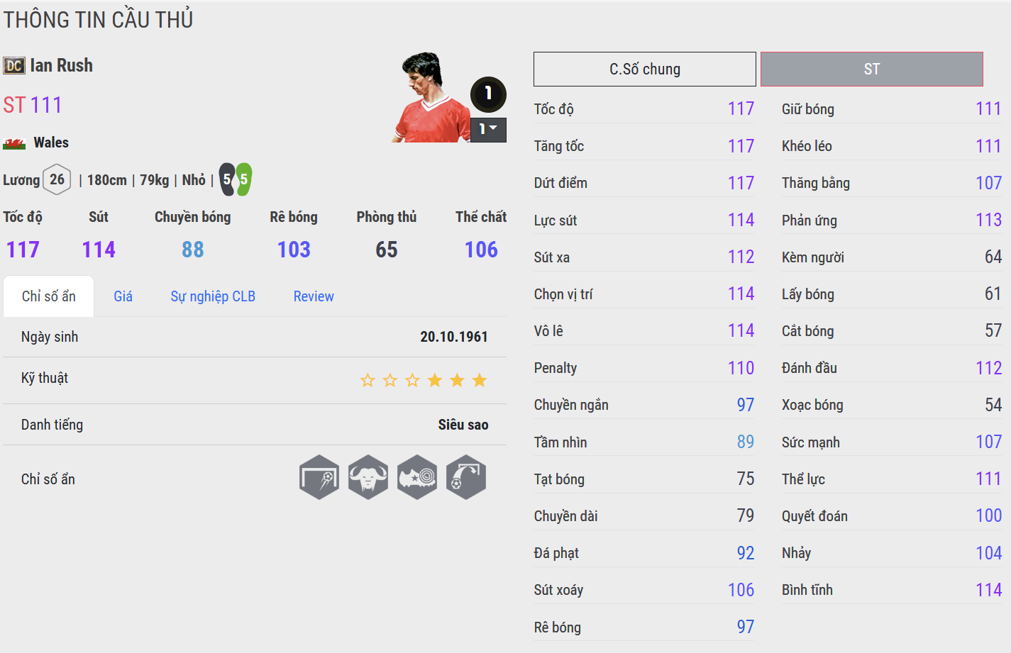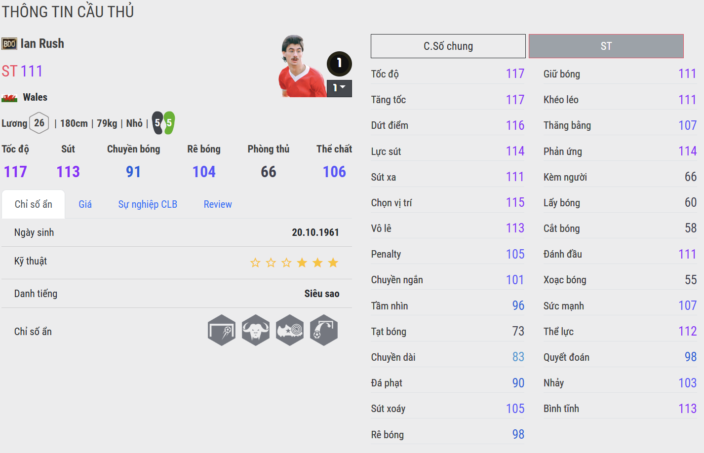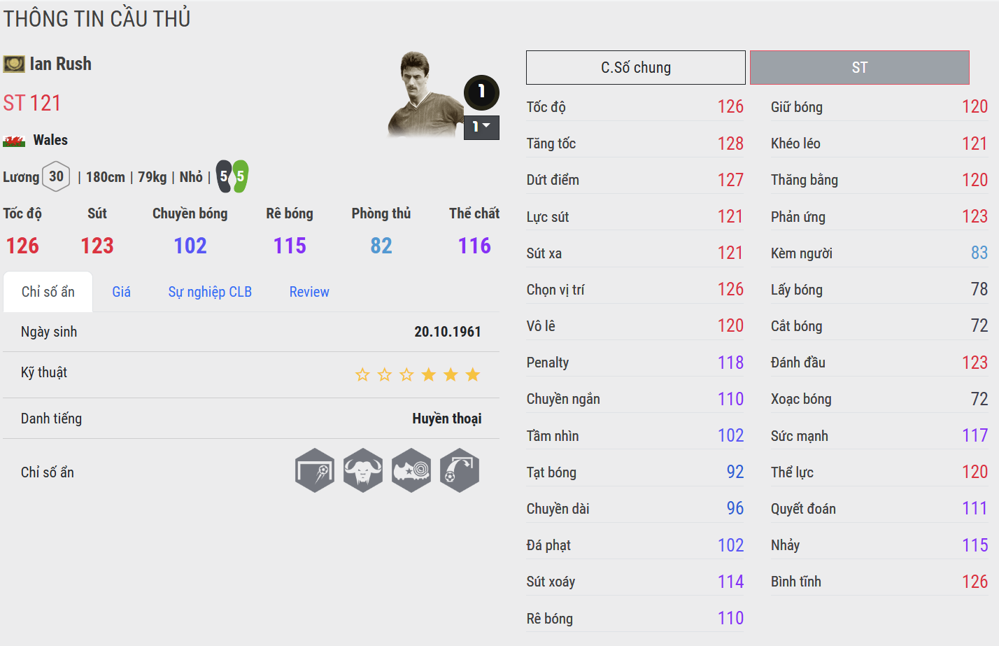 Ian Rush là huyền thoại của Liverpool và là một trong những tiền đạo xuất sắc nhất lịch sử bóng đá Anh. Ông nổi tiếng với bản năng săn bàn đáng sợ, tốc độ cùng khả năng chọn vị trí tuyệt vời.