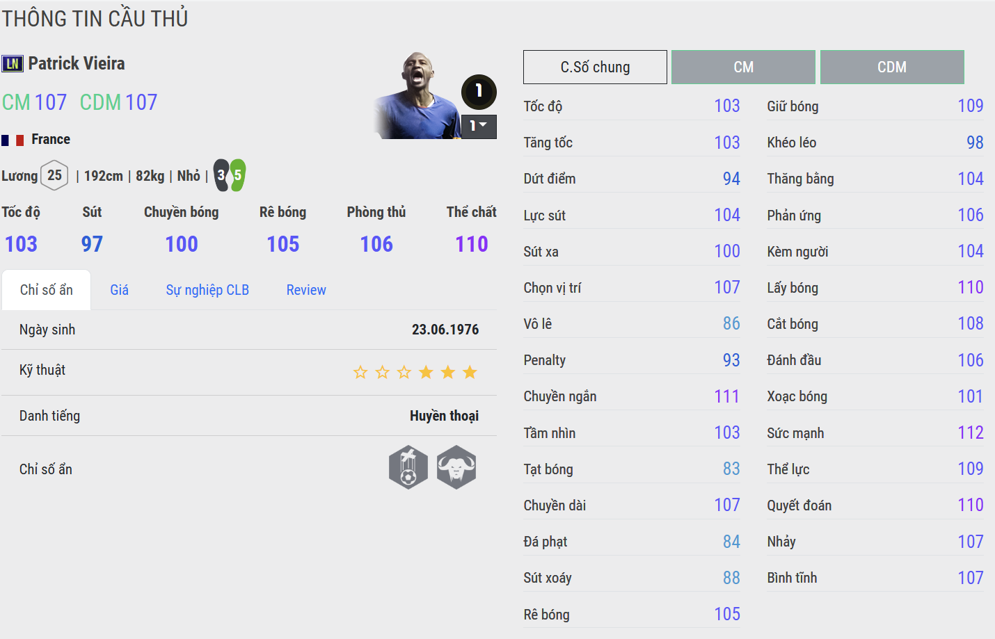 Patrick Vieira là một trong những tiền vệ trung tâm xuất sắc nhất lịch sử bóng đá Pháp và là biểu tượng bất diệt của Arsenal dưới triều đại Arsène Wenger. Sinh năm 1976, Vieira nổi bật với thể hình lý tưởng, khả năng tranh chấp mạnh mẽ cùng lối chơi thông minh và kỷ luật. Anh chính là “trái tim” nơi tuyến giữa của Arsenal trong giai đoạn đỉnh cao, đặc biệt góp công lớn trong mùa giải bất bại 2003/04 huyền thoại.