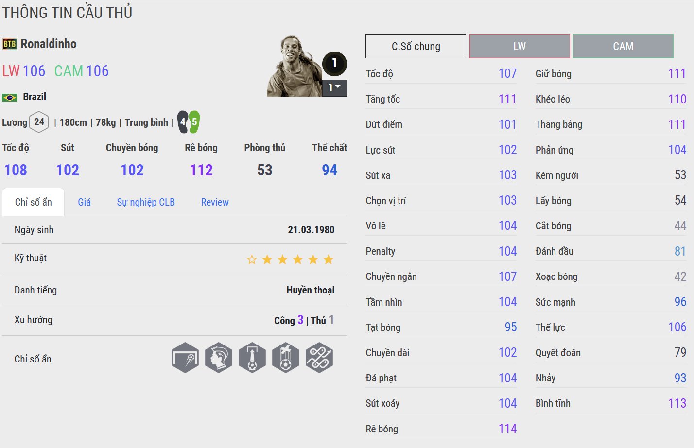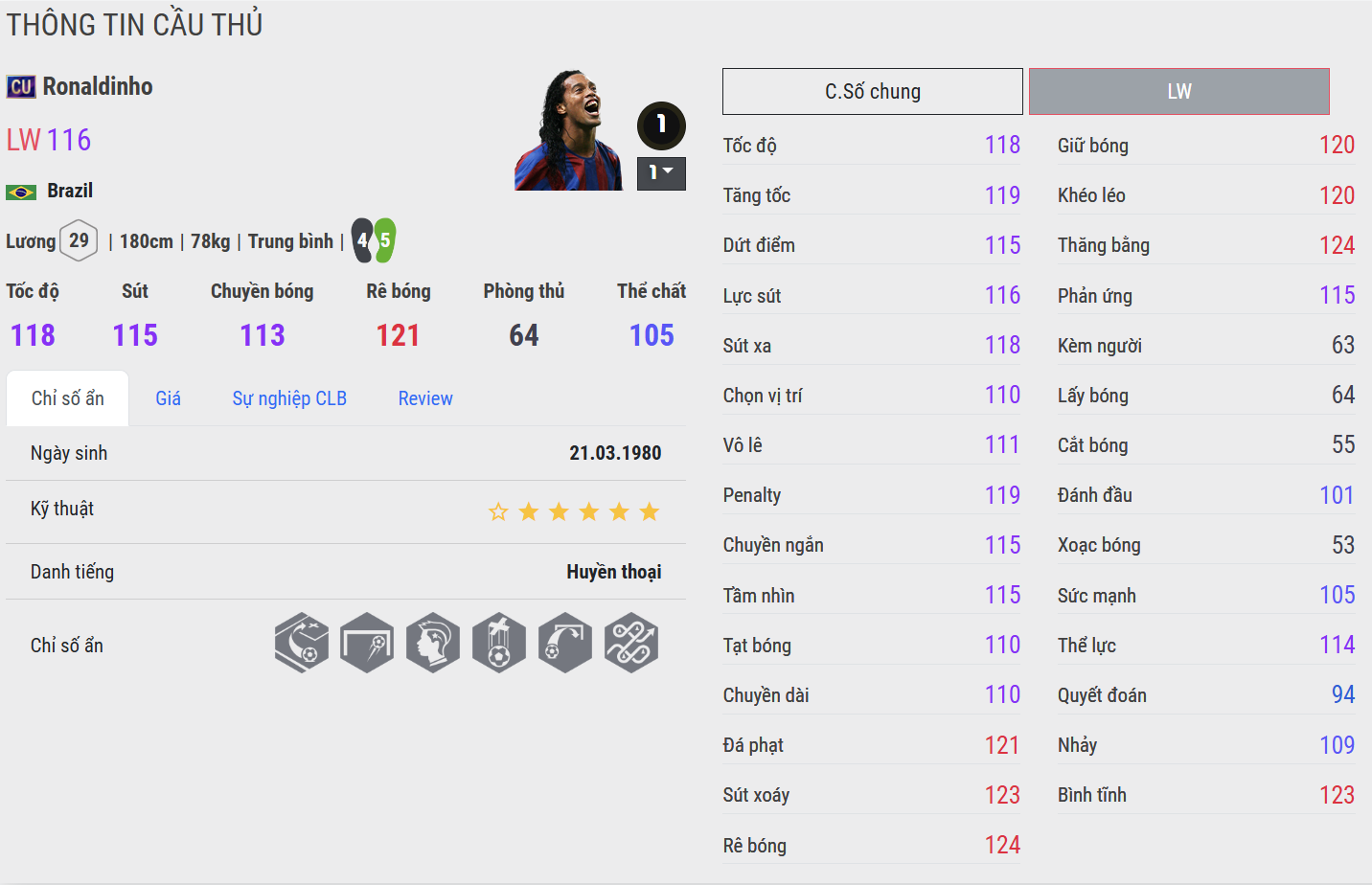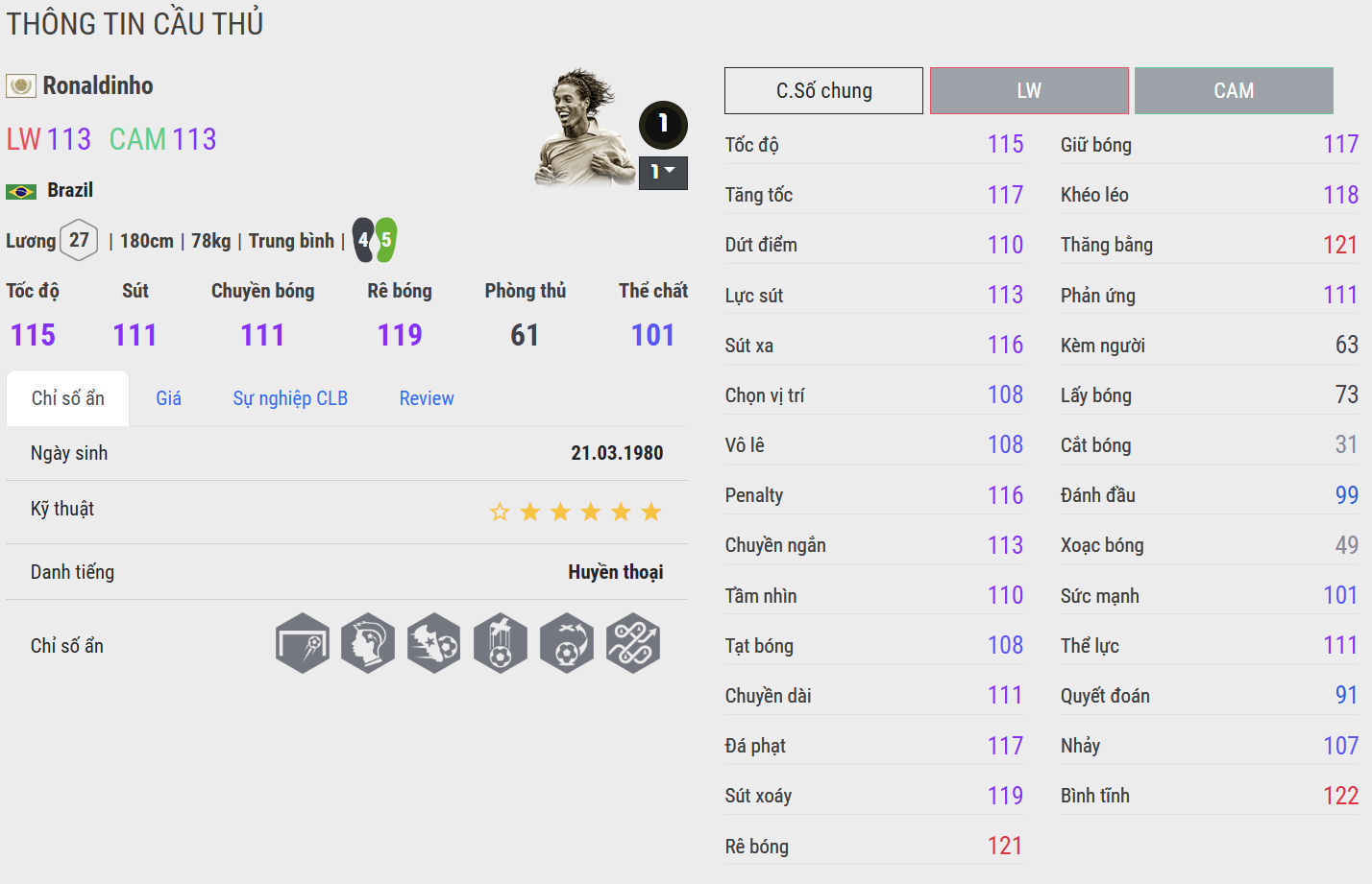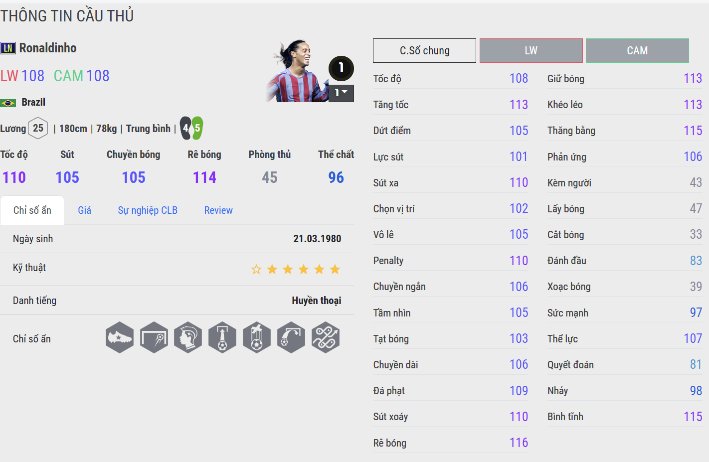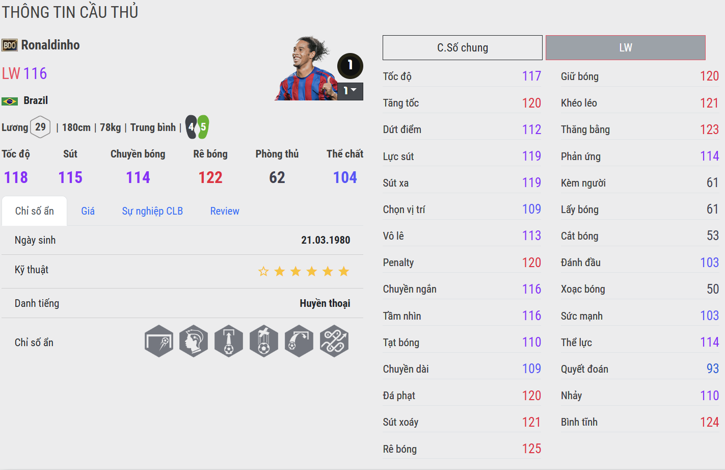 Ronaldinho, tên đầy đủ là Ronaldo de Assis Moreira, sinh ngày 21 tháng 3 năm 1980 tại Porto Alegre, Brazil. Anh là một cựu cầu thủ bóng đá chuyên nghiệp, thi đấu chủ yếu ở vị trí tiền vệ công và tiền đạo cánh.