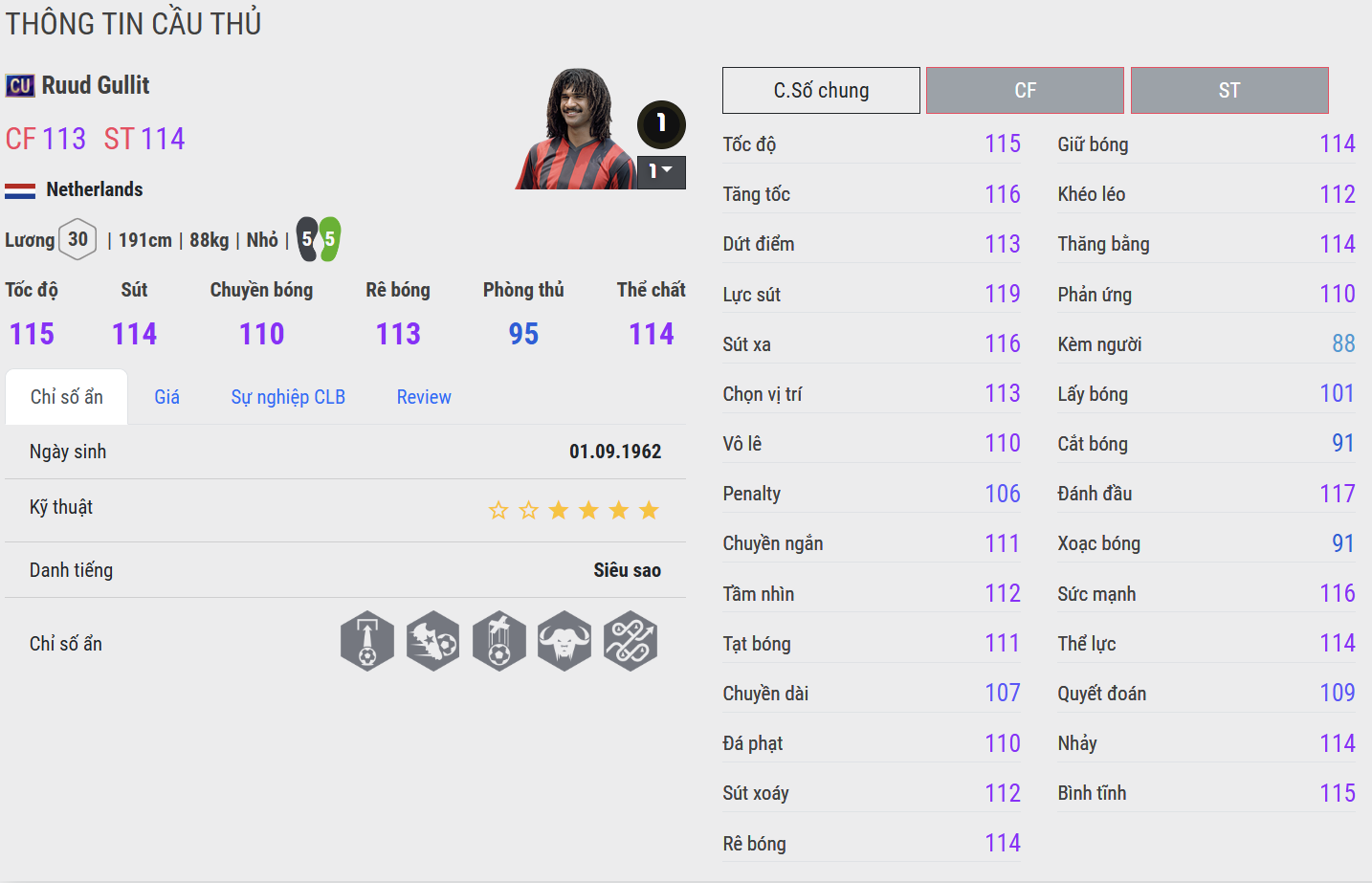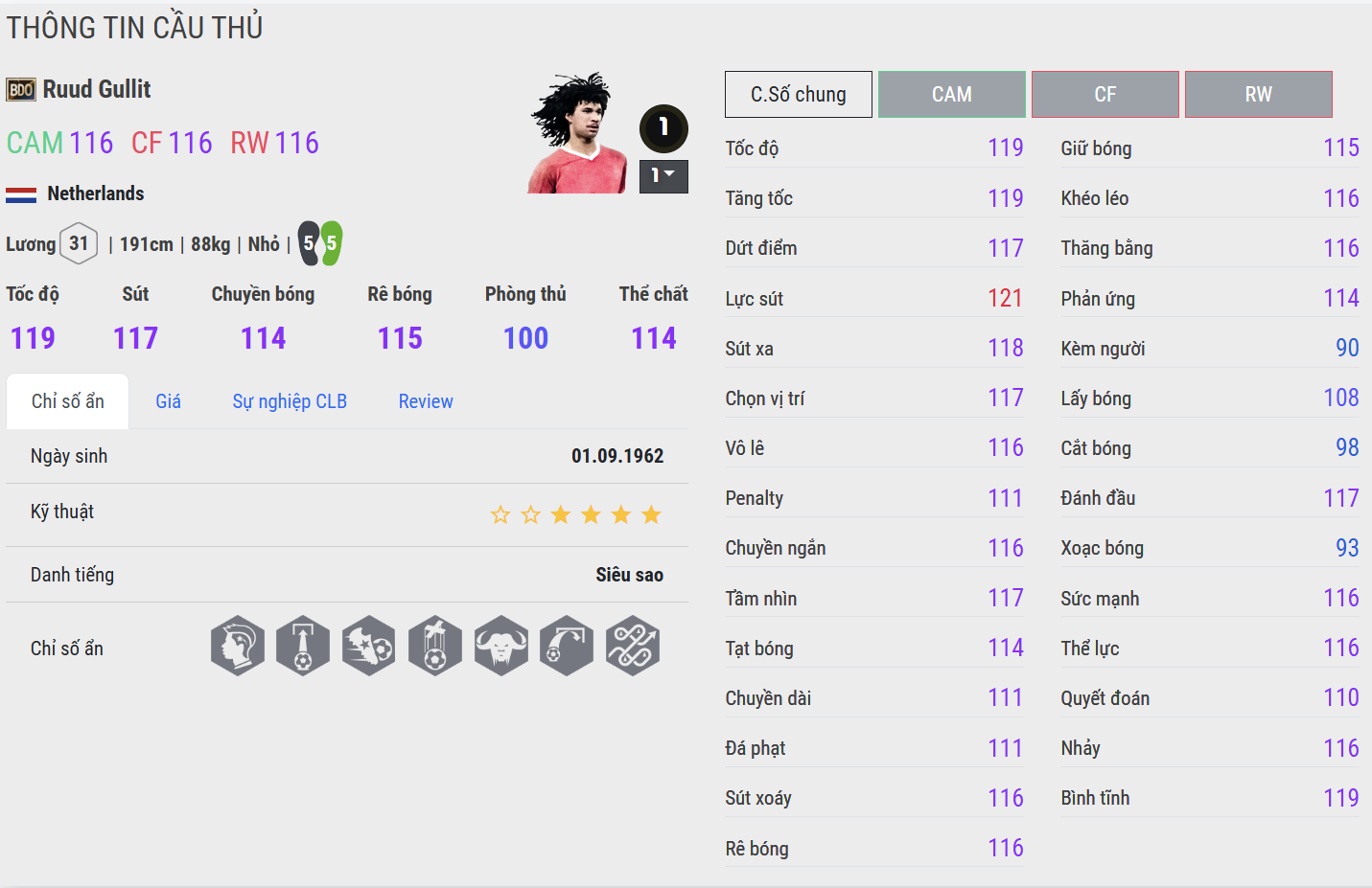 Ruud Gullit không chỉ là một trong những cầu thủ xuất sắc nhất trong lịch sử bóng đá Hà Lan, mà còn là hiện thân của sự đa năng, mạnh mẽ và tinh tế hiếm có. Với mái tóc xù đặc trưng và vóc dáng lực lưỡng, Gullit thi đấu như một thủ lĩnh đích thực trên sân – một “tổng chỉ huy” vừa có thể chơi ở hàng tiền vệ, vừa bùng nổ ở vị trí tấn công.
