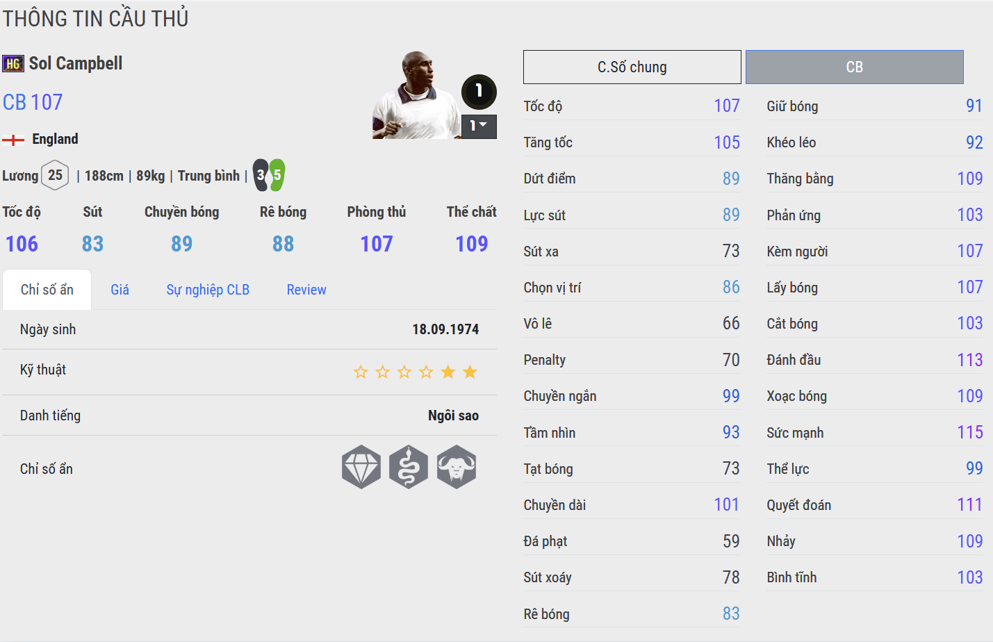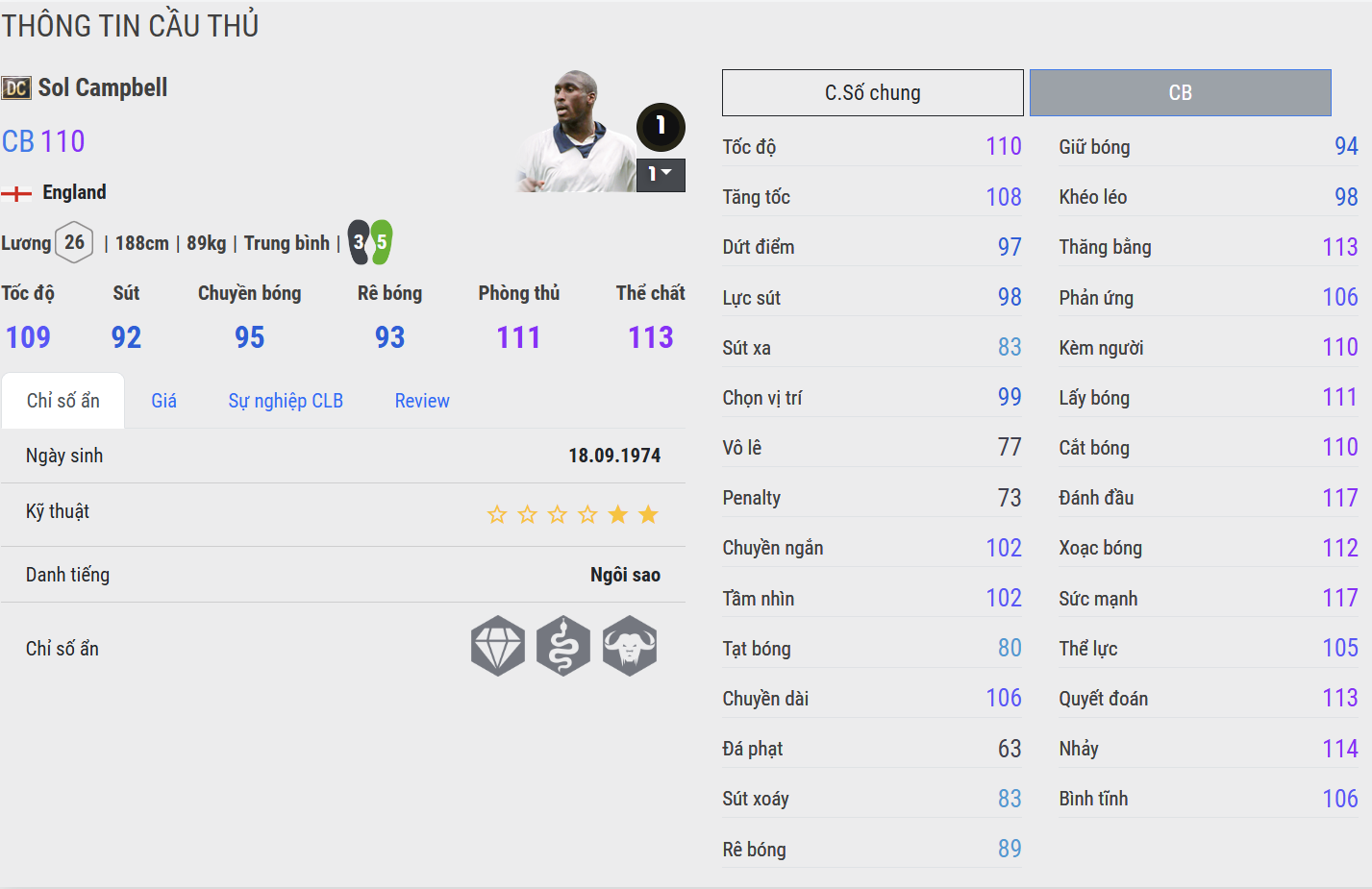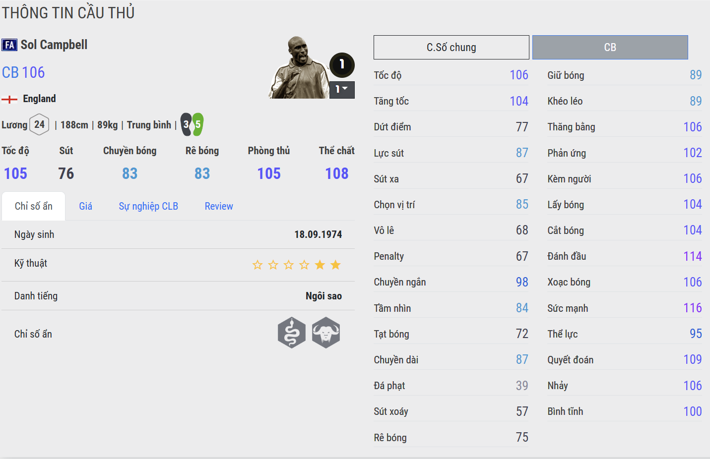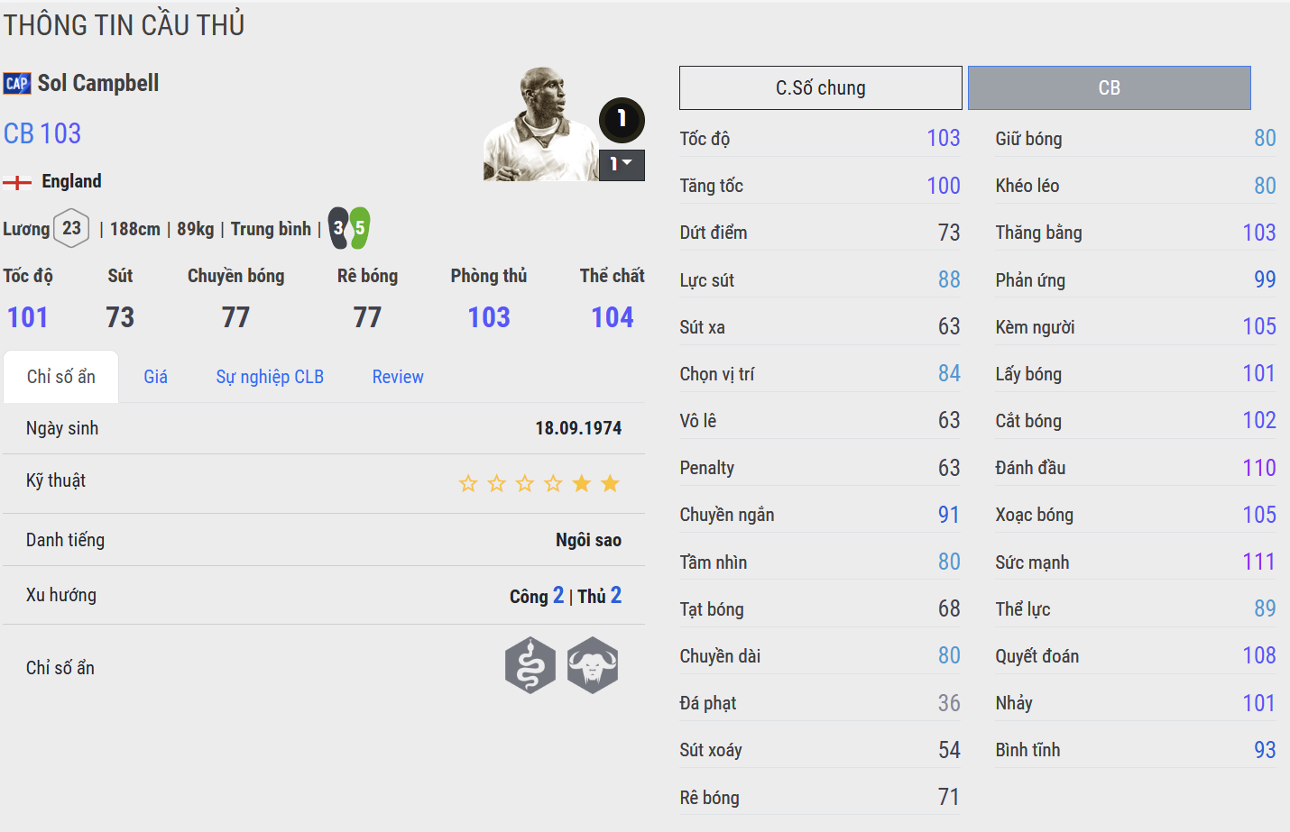 Sol Campbell là hình mẫu trung vệ thép của bóng đá Anh – mạnh mẽ, lạnh lùng và gần như không thể bị đánh bại trong các tình huống tay đôi. Sinh năm 1974, Campbell ghi dấu ấn với thể hình vạm vỡ, khả năng đọc tình huống xuất sắc và lối chơi không khoan nhượng.