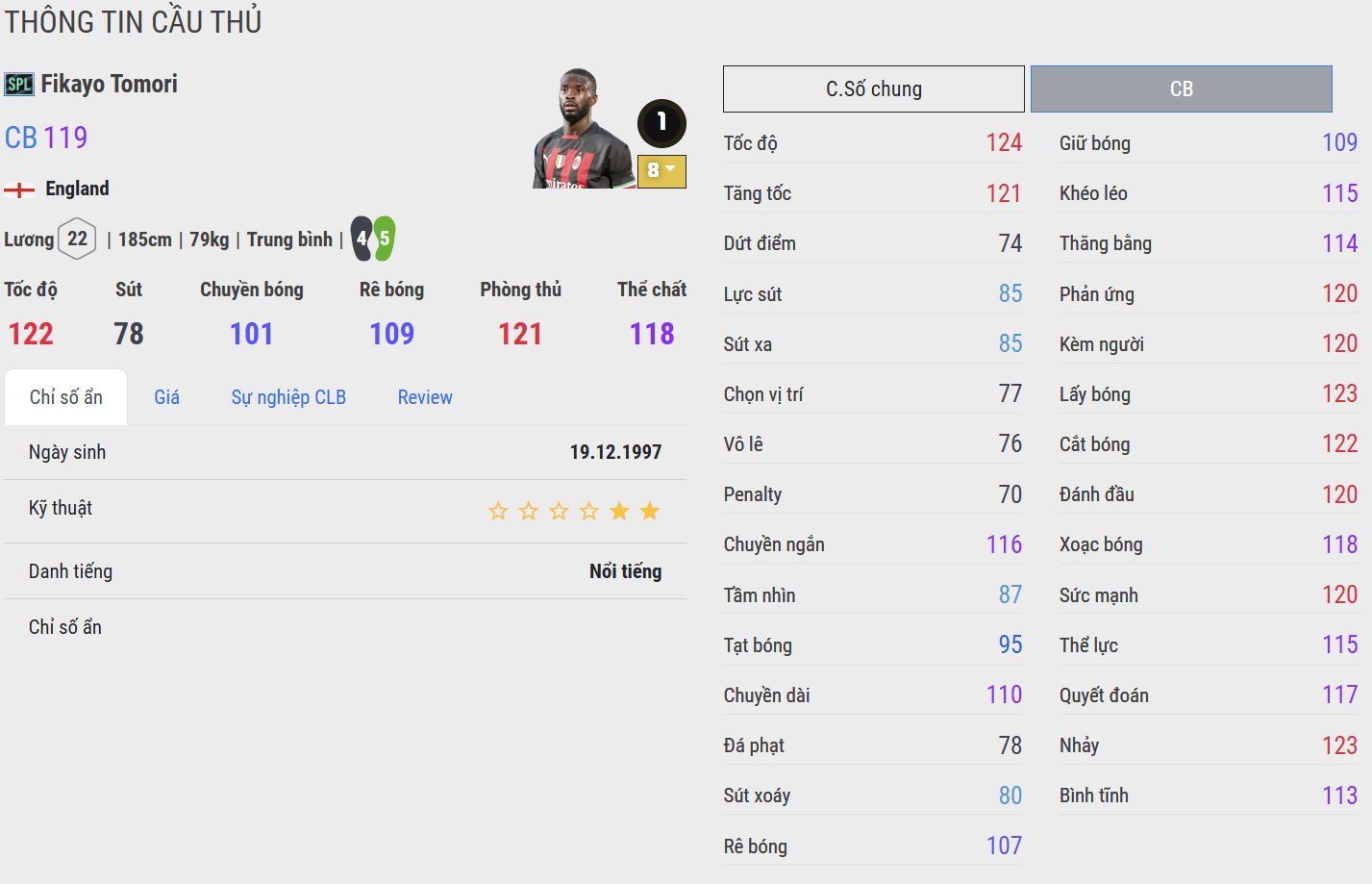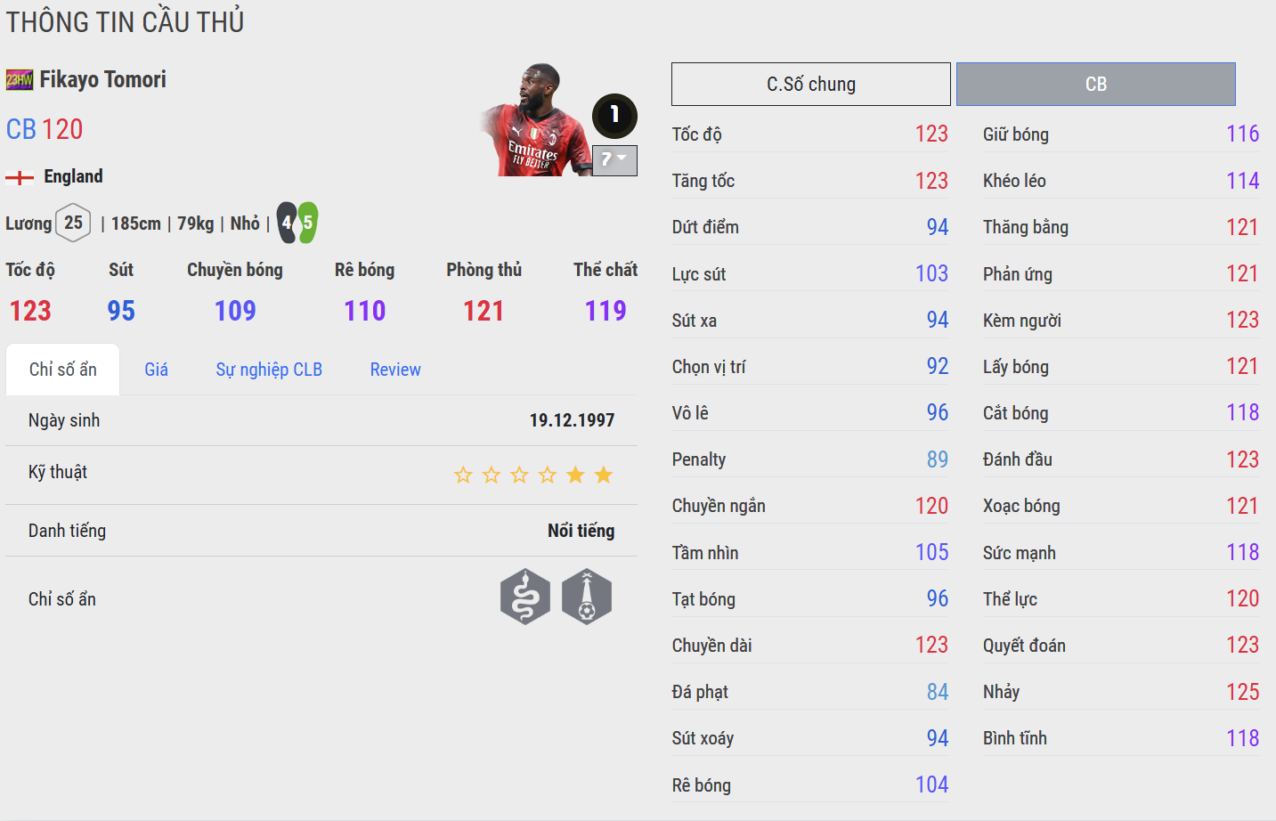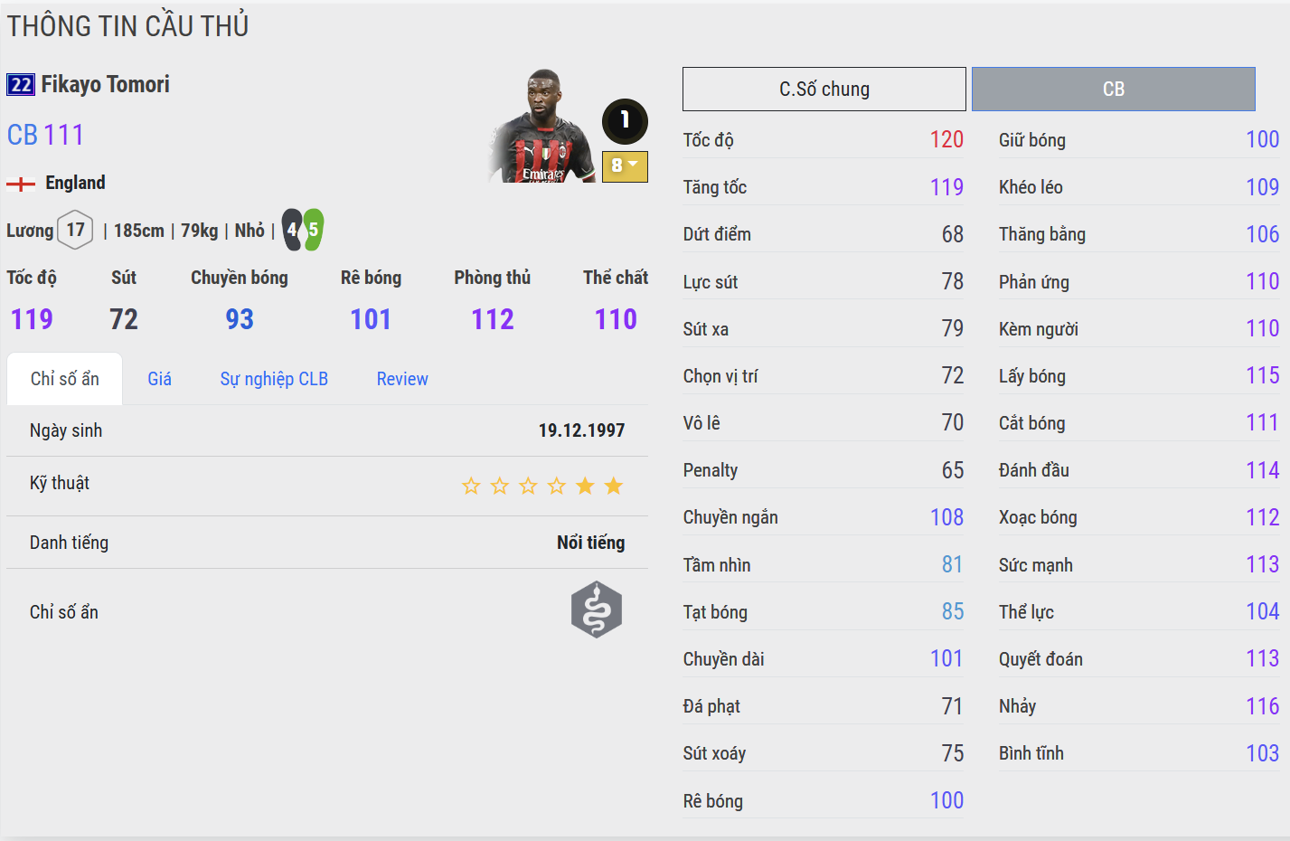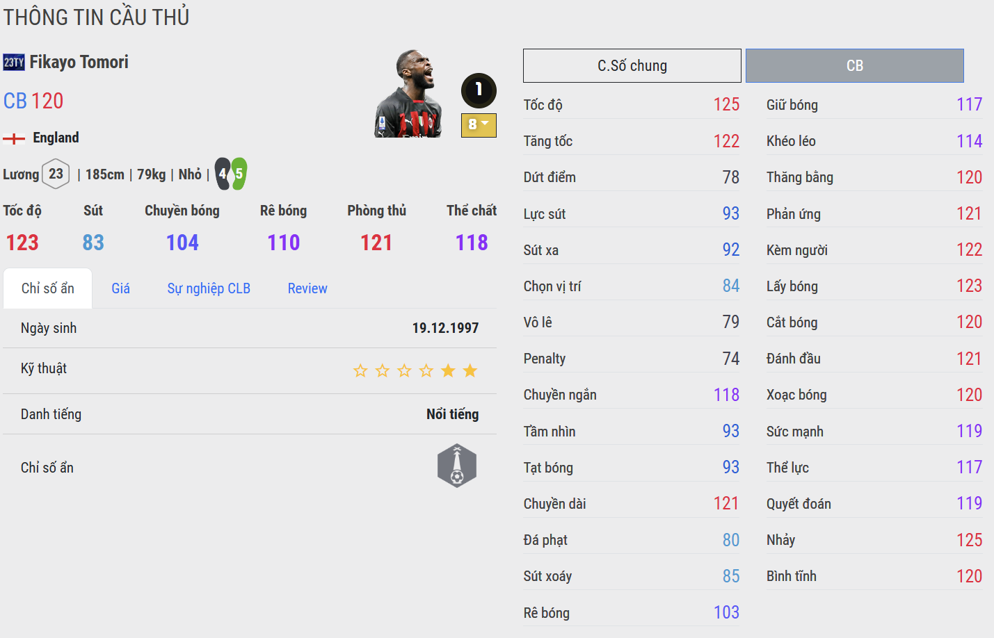 Fikayo Tomori được đánh giá là một trong những trung vệ hàng đầu trong game khi sở hữu tốc độ và khả năng cắt bóng cực kì ấn tượng. Không chỉ có vậy, anh còn sở hữu nhiều team color nổi bật như Chelsea, AC Milan, ĐT Anh...