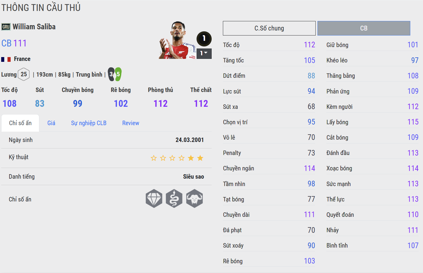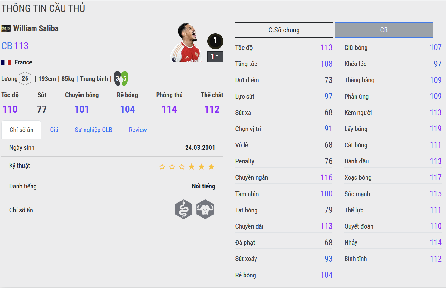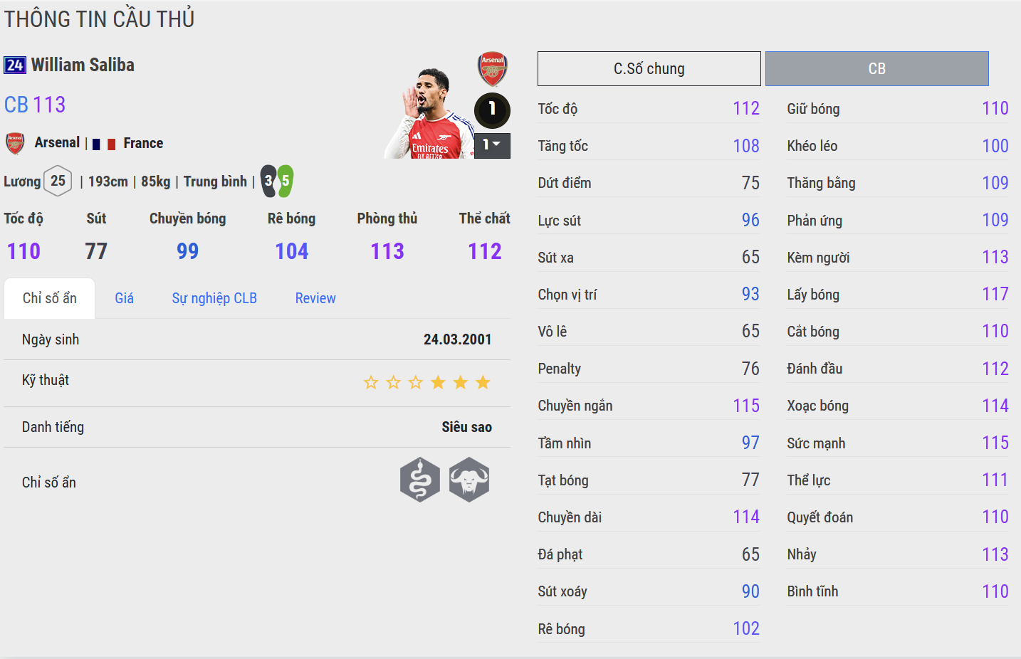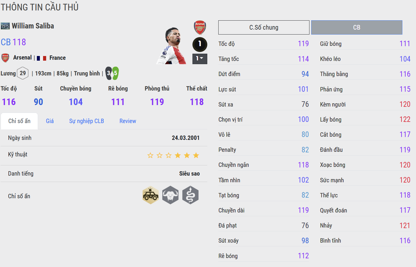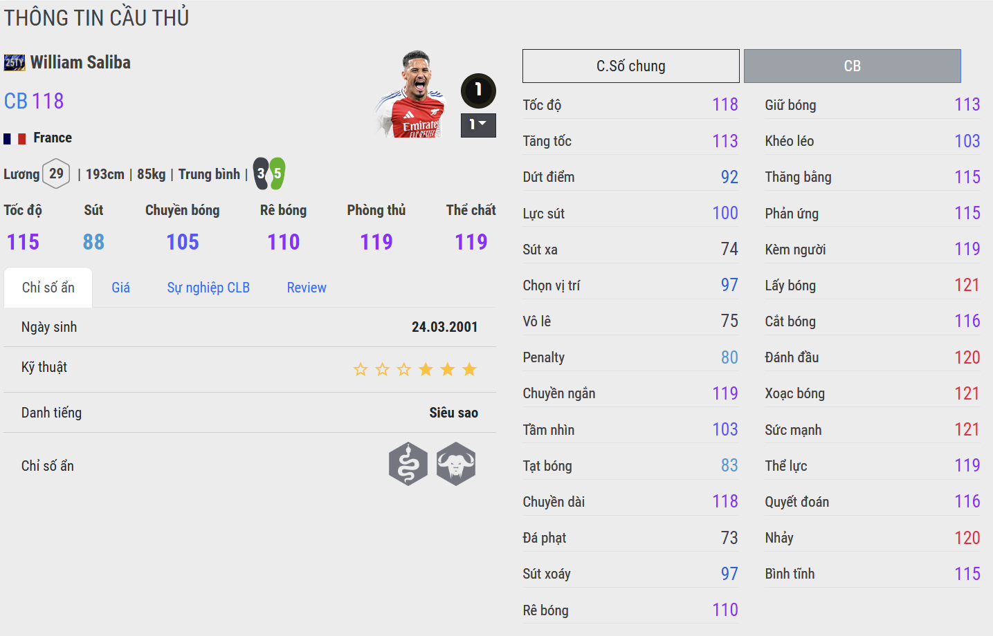 William Saliba – trung vệ trẻ tài năng của bóng đá Pháp, hiện là chốt chặn đáng tin cậy trong màu áo Arsenal. Sở hữu thể hình lý tưởng, tốc độ ấn tượng cùng khả năng phán đoán thông minh, Saliba nhanh chóng khẳng định mình như một trong những hậu vệ triển vọng hàng đầu châu Âu.