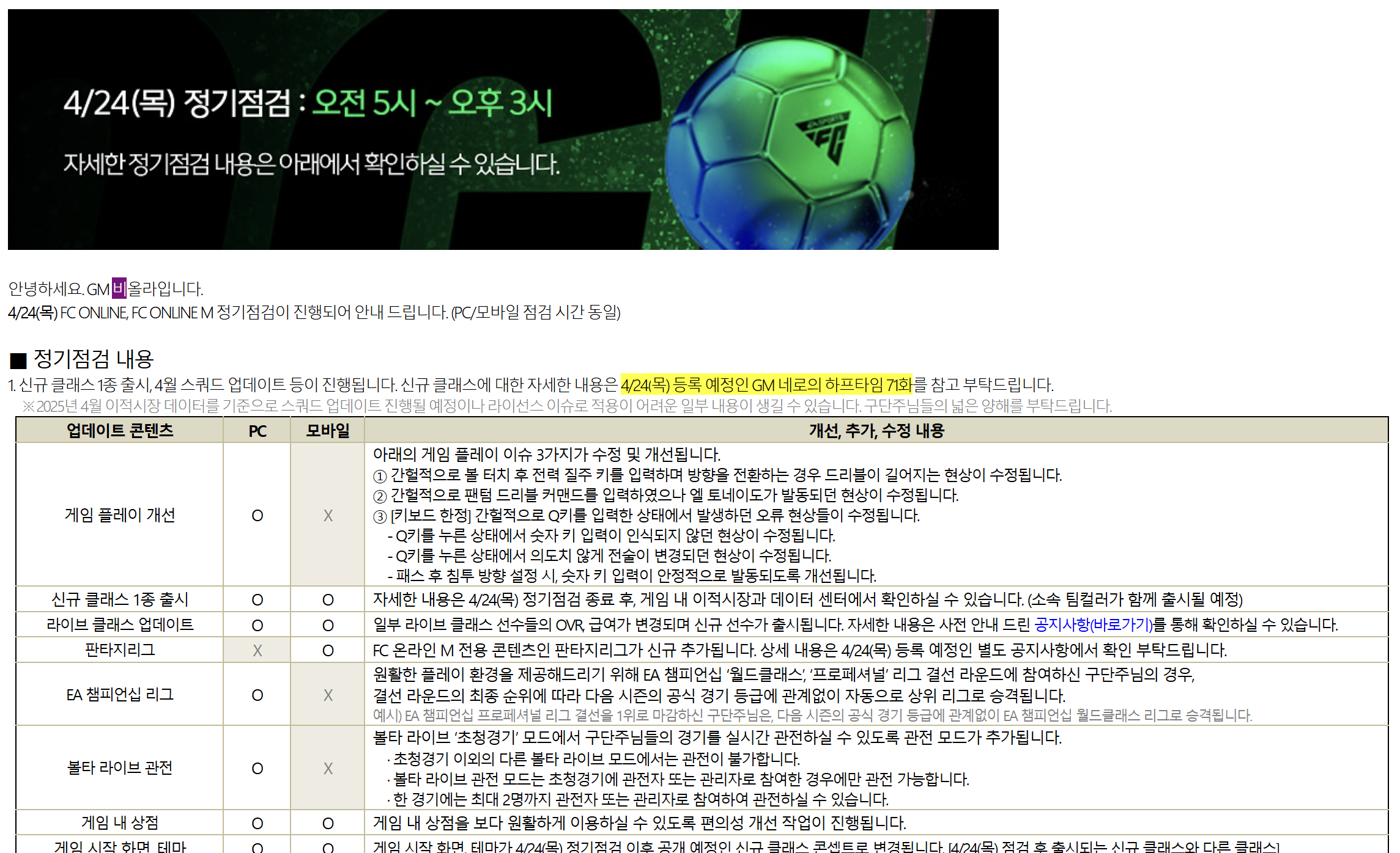 Hôm nay, GM Viola của FC Online Hàn Quốc đã đưa ra thông báo chính thức về thông tin cập nhật mới nhất của game vào thứ 5, ngày 24/4/2025. Đây được xem là một bản cập nhật đáng quan tâm khi ra mắt mùa thẻ mới cùng với đó là sửa lỗi gameplay và cập nhật thêm một số tính năng khác.
