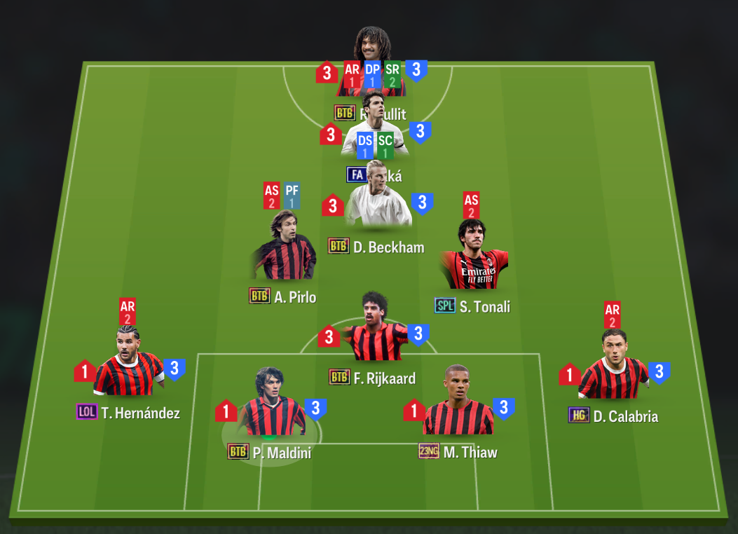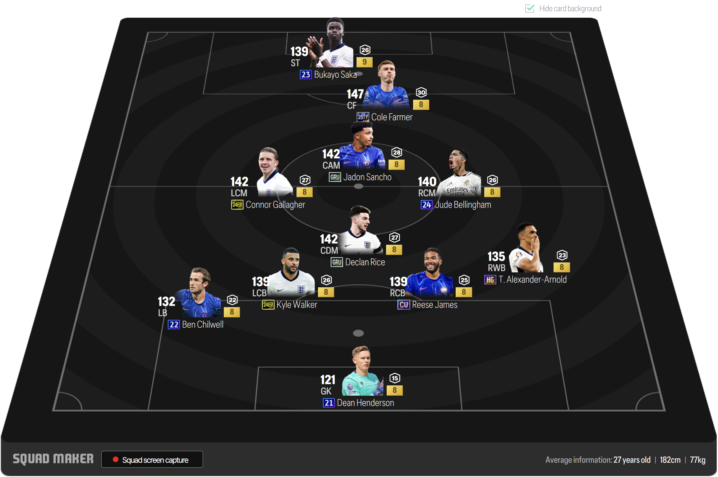 Sơ đồ 41212 với vị trí tiefn đạo cắm được lựa chọn là Bukayo Saka. Thi đấu hộ công ngay dưới anh là Cole Palmer, cả 2 đều có AI di chuyển và dứt điểm khá tốt. Tiền vệ công được lựa chọn là Sancho, một trong những cái tên sở hữu khả năng thi đấu rất đa dạng. Phía dưới là cặp tiền vệ trung tâm Gallagher và Bellingham, 2 tiền vệ cực kì đa năng khi vừa hỗ trợ tấn công tốt vừa tham gia phòng ngự linh hoạt.