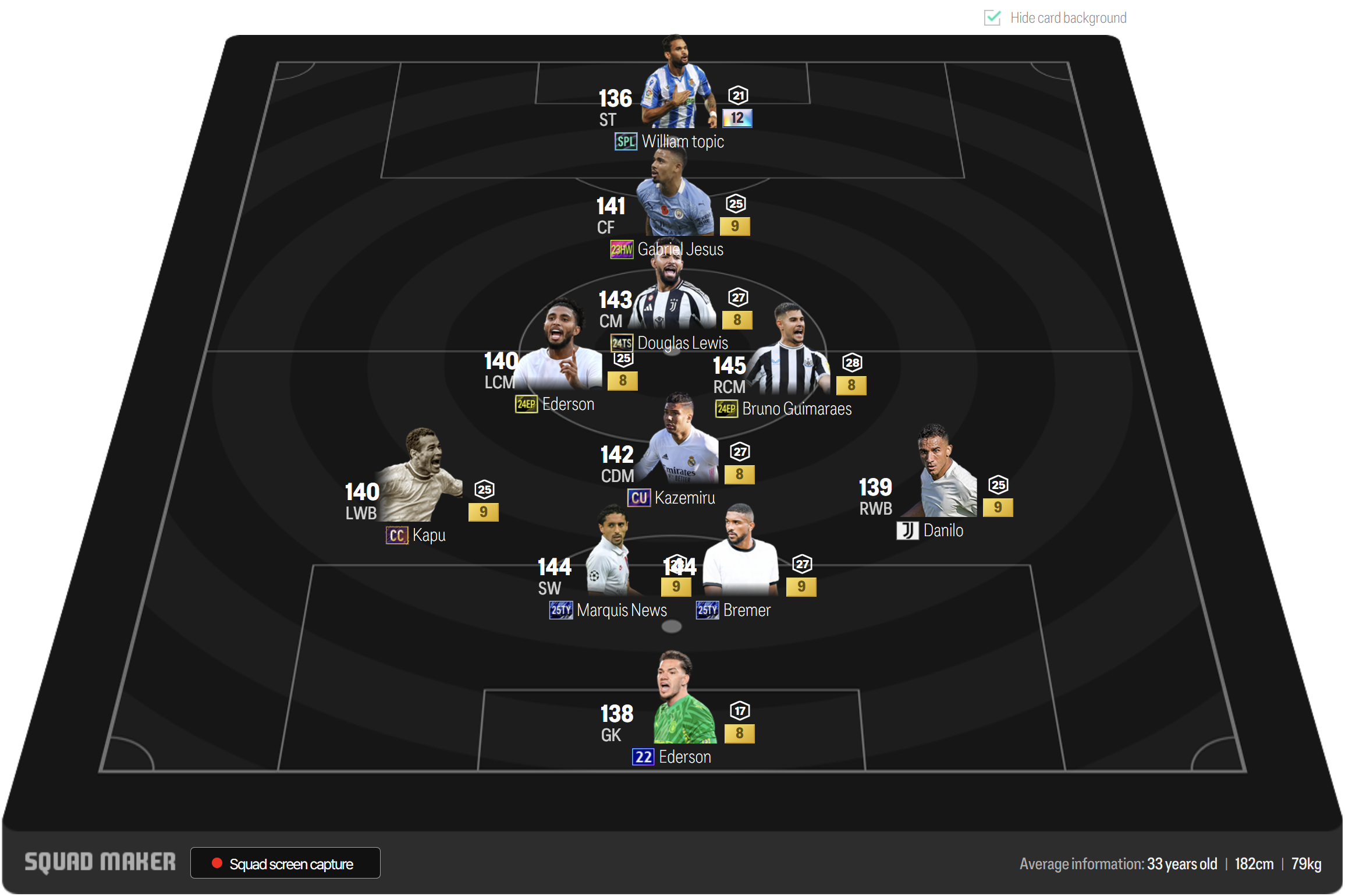 Sơ đồ được lựa chọn trong GLXH là 41212 đang cực kì thịnh hành. Vị trí tiền đạo cắm được lựa chọn là Willian Jose, vai trò hộ công phía sau là Gabriel Jesus, một cầu thủ có AI di chuyển rất thông minh. Tiền vệ công Douglas Luis được tin dùng cho vị trí tiền vệ công trong sơ đồ. Cặp tiền vệ trung tâm LCM, RCM lần lượt là Ederson và Bruno Guimaraes.