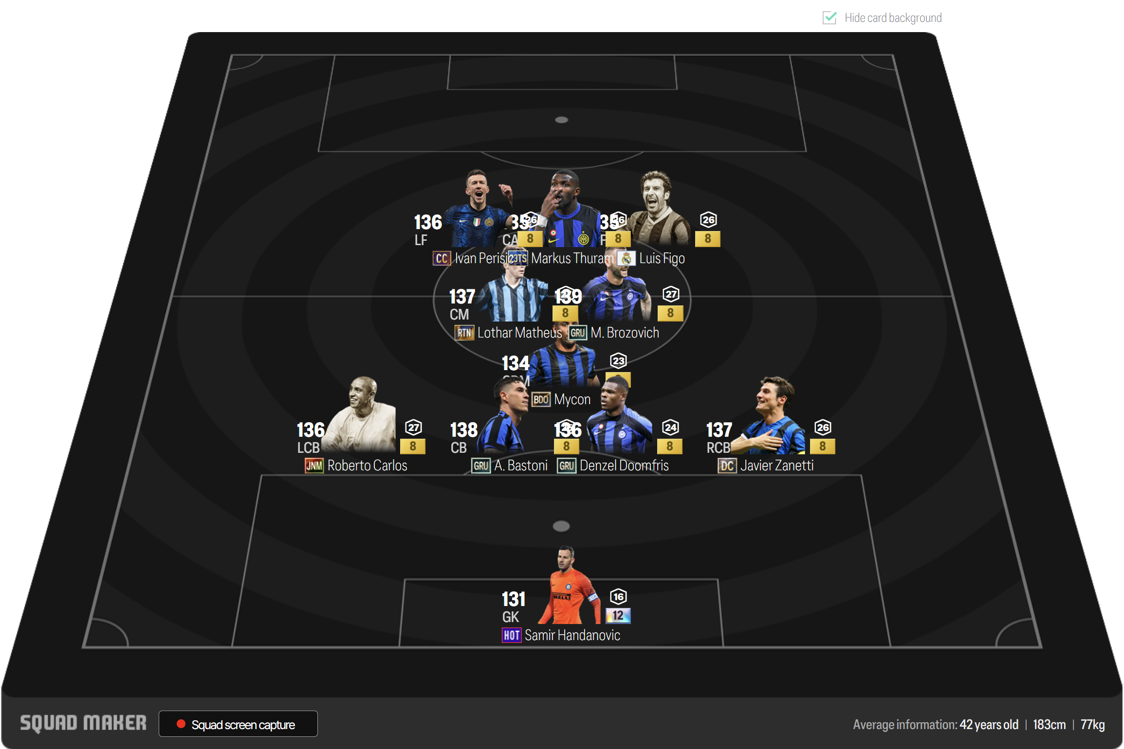 Sơ đồ 41212 với vị trí LF,RF được lựa chọn là Perisic và Figo, cả 2 đều có khả năng thi đấu đa năng cả về tấn công, chuyền bóng, sút bóng cho tới rê dắt xử lý. Tiền vệ công được lựa chọn là Thuram, một trong những tiền đạo khá nổi bật thời gian gần đây. Cặp tiền vệ trung tâm Matthaus và Brozovic được tin dùng ở khu vực giữa sân với khả năng chuyền bóng lẫn hỗ trợ tấn công đều rất ổn.