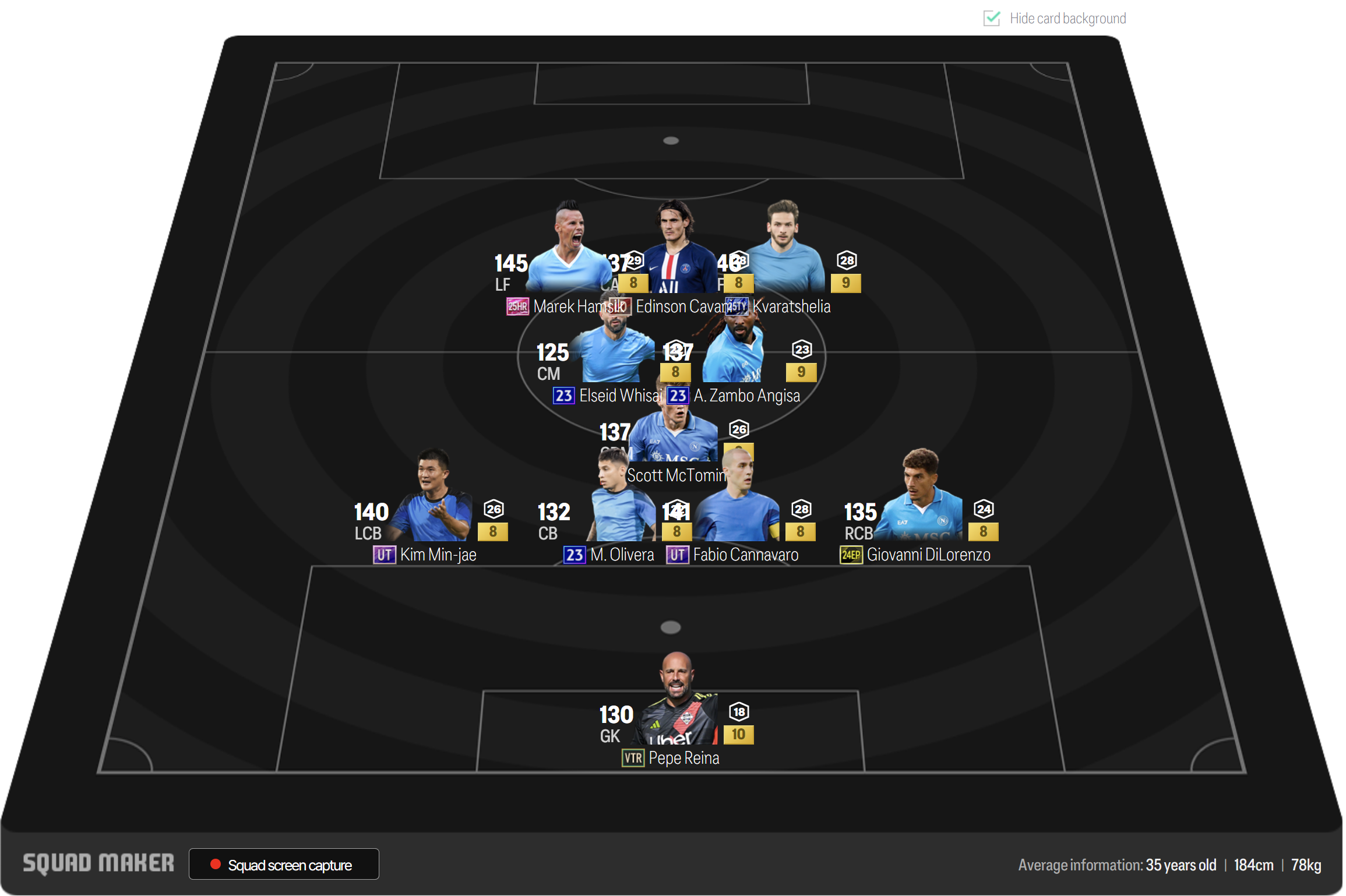 Sơ đồ 41212 được thiết lập và xếp dưới dạng tam giác úp ngược. Cặp đôi LF, RF được lựa chọn là Hamsik và Kvaratskhelia. Tiền vệ tấn công Cavani được thiết lập sẽ là nhân tố tấn công chủ chốt của đội. Cặp tiền vệ trung tâm Hysaj và Zambo Anguissa là những cái tên được chọn cho khu vực tuyến giữa.