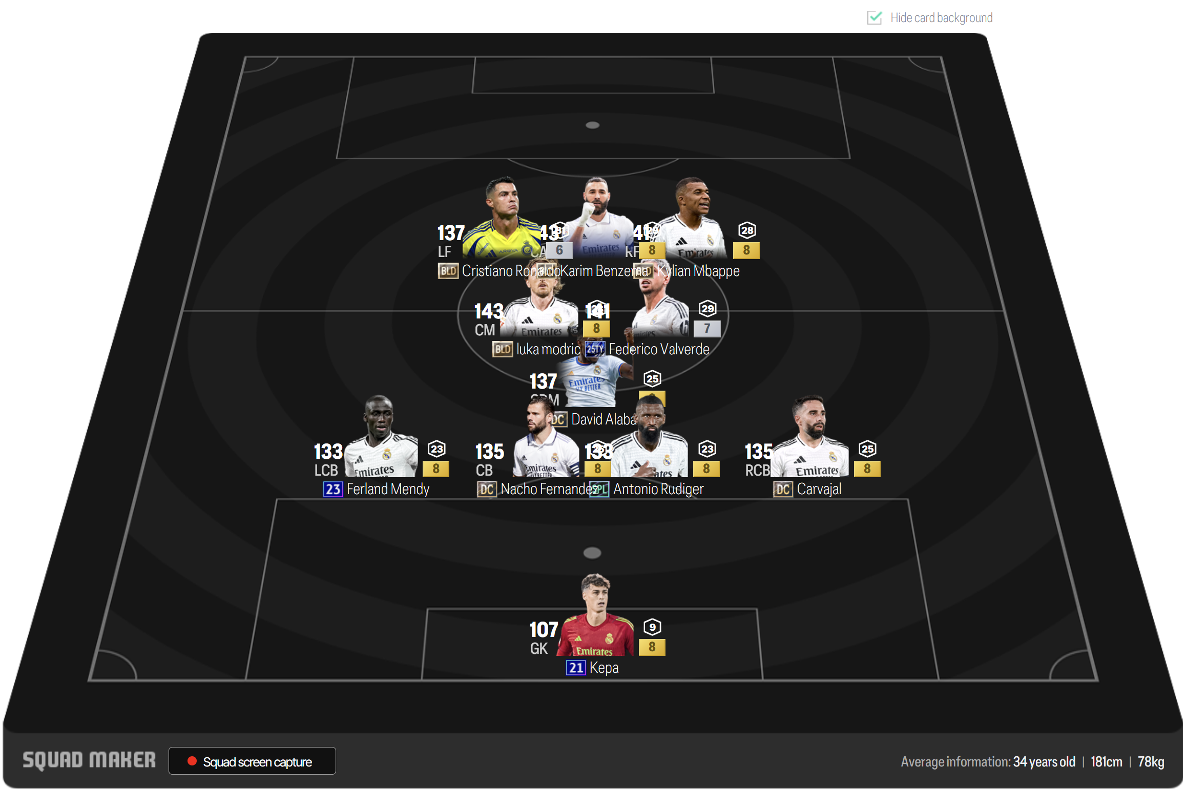 Sơ đồ 41212 với cặp hộ công LF và RF lần lượt là Cristiano Ronaldo và Mbappe. Thi đấu hơi lùi sau 1 chút là vị trí CAM được lựa chọn là Benzema, một trong những cái tên cực uy tín hiện tại. Cặp tiền vệ trung tâm LCM và RCM lần lượt là Modric và Valverde.