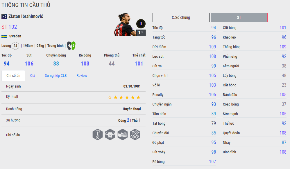Thể hình trung bình, 5 sao kỹ thuật, rê bóng ở lvl 1 thẻ + 1 lên tới 107. Nhưng tôi cá với bạn là nếu rê bóng bạn sẽ thấy giống như một anh công nhân hơn là một cầu thủ kỹ thuật tốt như Ibrahimovic ngoài đời đấy. Zola có thể cho Ibrahimovic trong game chóng mặt với khả năng rê bóng của mình.