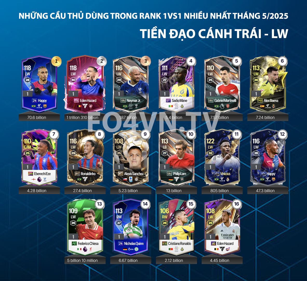 Dù là trung phong cắm (ST), hộ công (CF) hay chạy cánh (LW/RW), các cầu thủ tấn công đều mang trong mình nhiệm vụ quan trọng: chuyển hóa áp lực thành bàn thắng. Mỗi mùa thẻ lại mang đến những lựa chọn khác biệt – từ mẫu ST cổ điển mạnh mẽ như Haaland, đến những "nghệ sĩ" mềm mại như Neymar hay Messi.